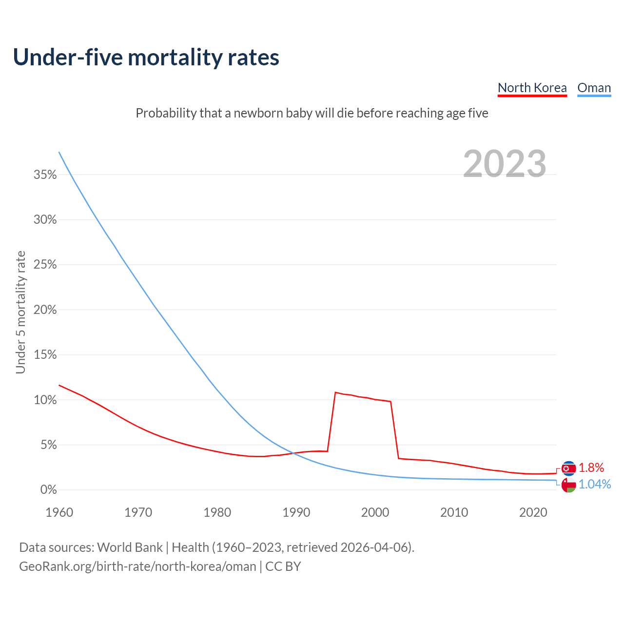 The chance that a newborn baby will die before reaching age five is 1.8% in North Korea and 1.04% in Oman. Above is a chart with historical data on under-five mortality rates.