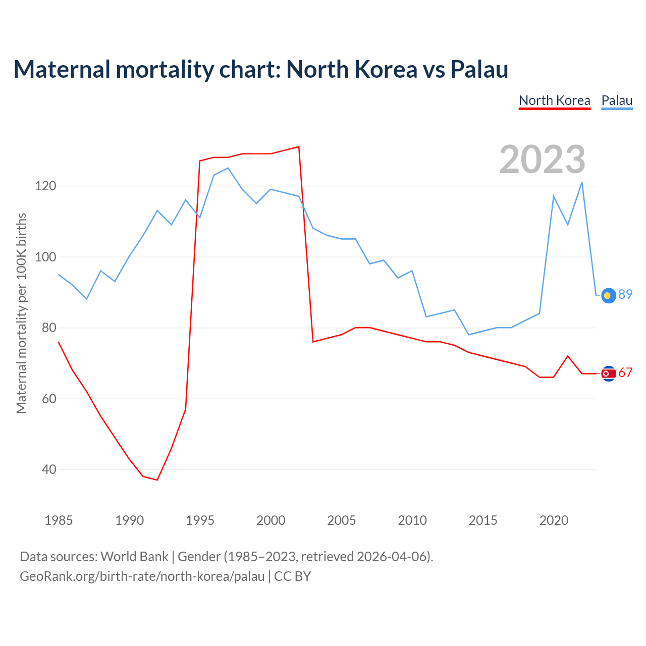 The maternal mortality rate, which is the probability of dying during childbirth or within 42 days of pregnancy termination, is 67 deaths per 100,000 live births in North Korea, compared to 89 deaths in Palau.