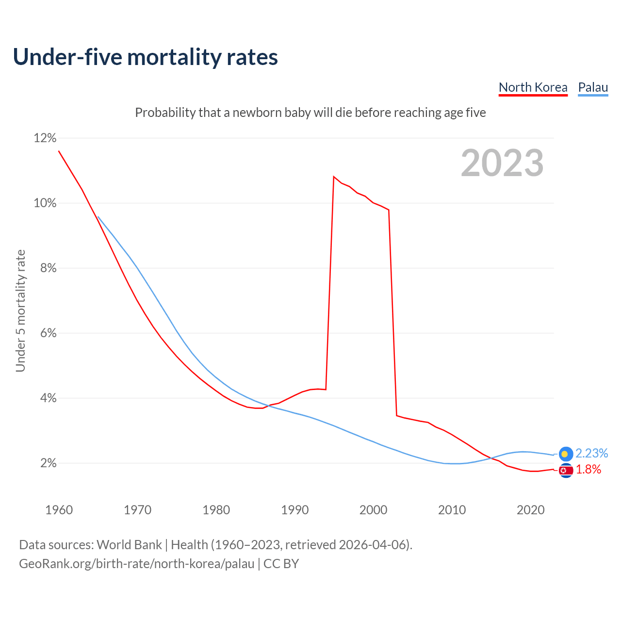 The chance that a newborn baby will die before reaching age five is 1.8% in North Korea and 2.23% in Palau. Above is a chart with historical data on under-five mortality rates.