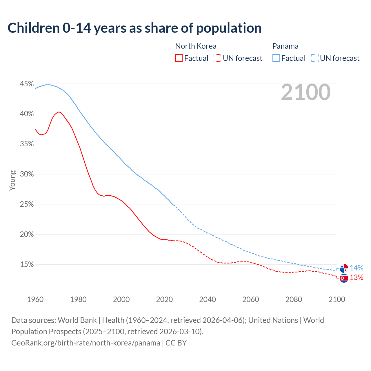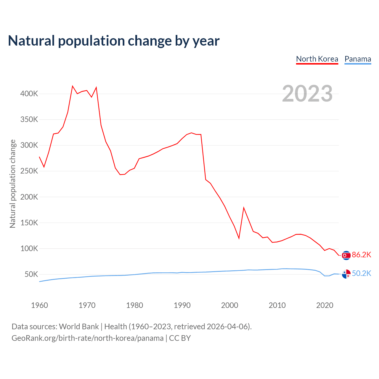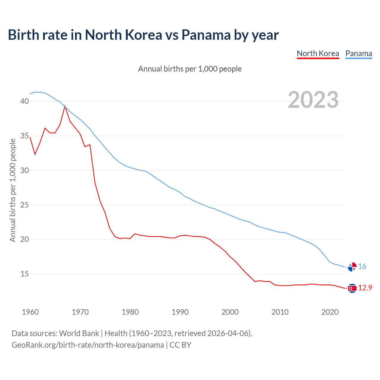 North Korea has an annual birth rate of 12.9 births per 1,000 people, compared to 16 for Panama. The average number of children a woman is expected to have during her lifetime — the fertility rate, is 1.78 in North Korea and 2.12 in Panama — 19% difference.