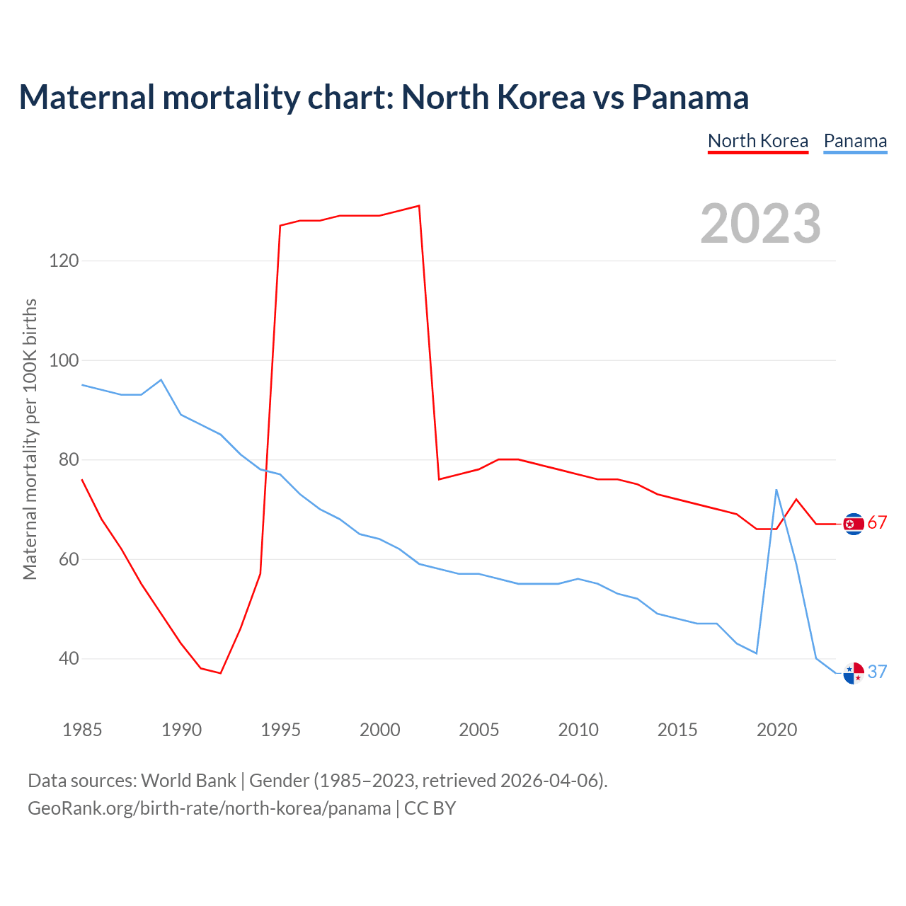 The maternal mortality rate, which is the probability of dying during childbirth or within 42 days of pregnancy termination, is 67 deaths per 100,000 live births in North Korea, compared to 37 deaths in Panama.