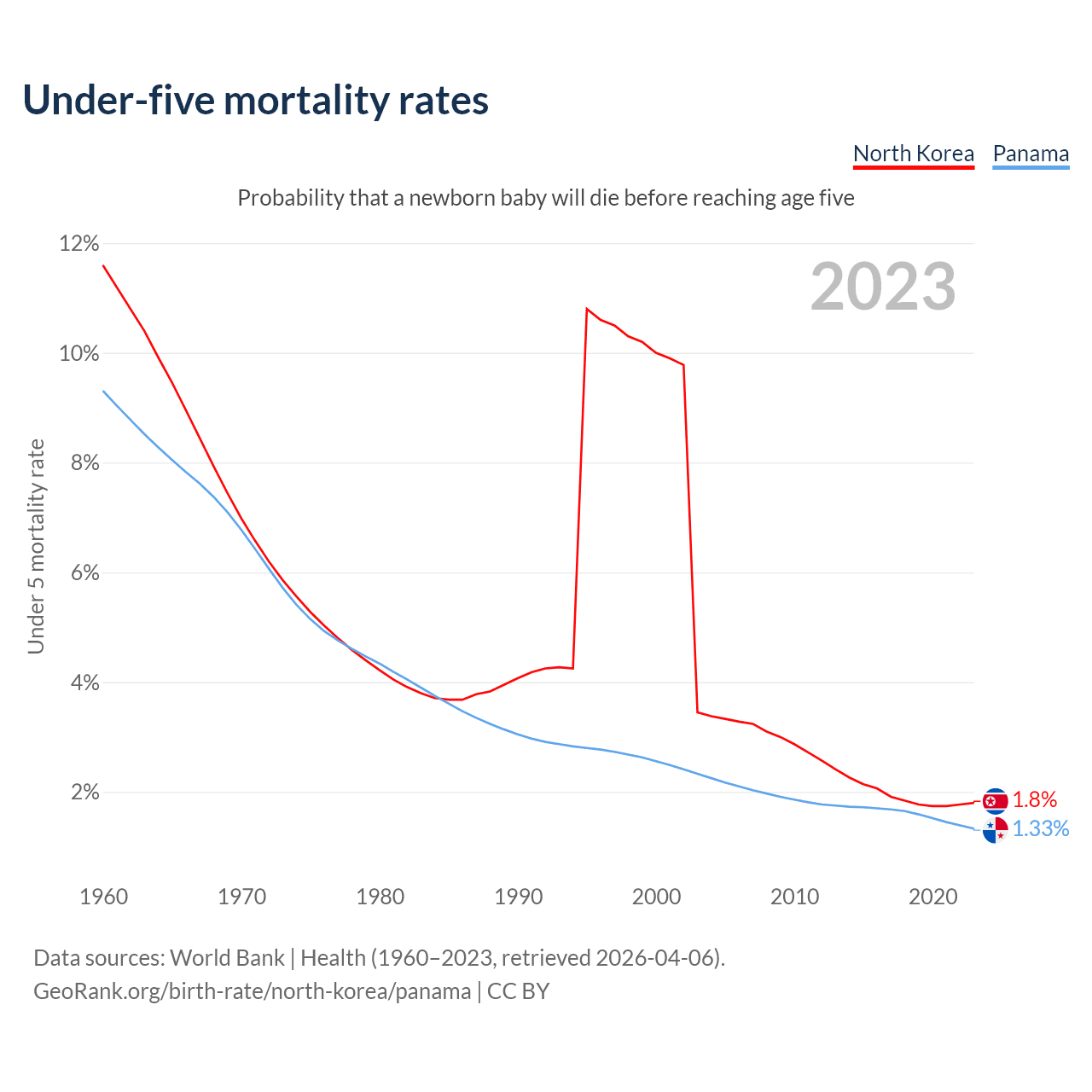 The chance that a newborn baby will die before reaching age five is 1.8% in North Korea and 1.33% in Panama. Above is a chart with historical data on under-five mortality rates.