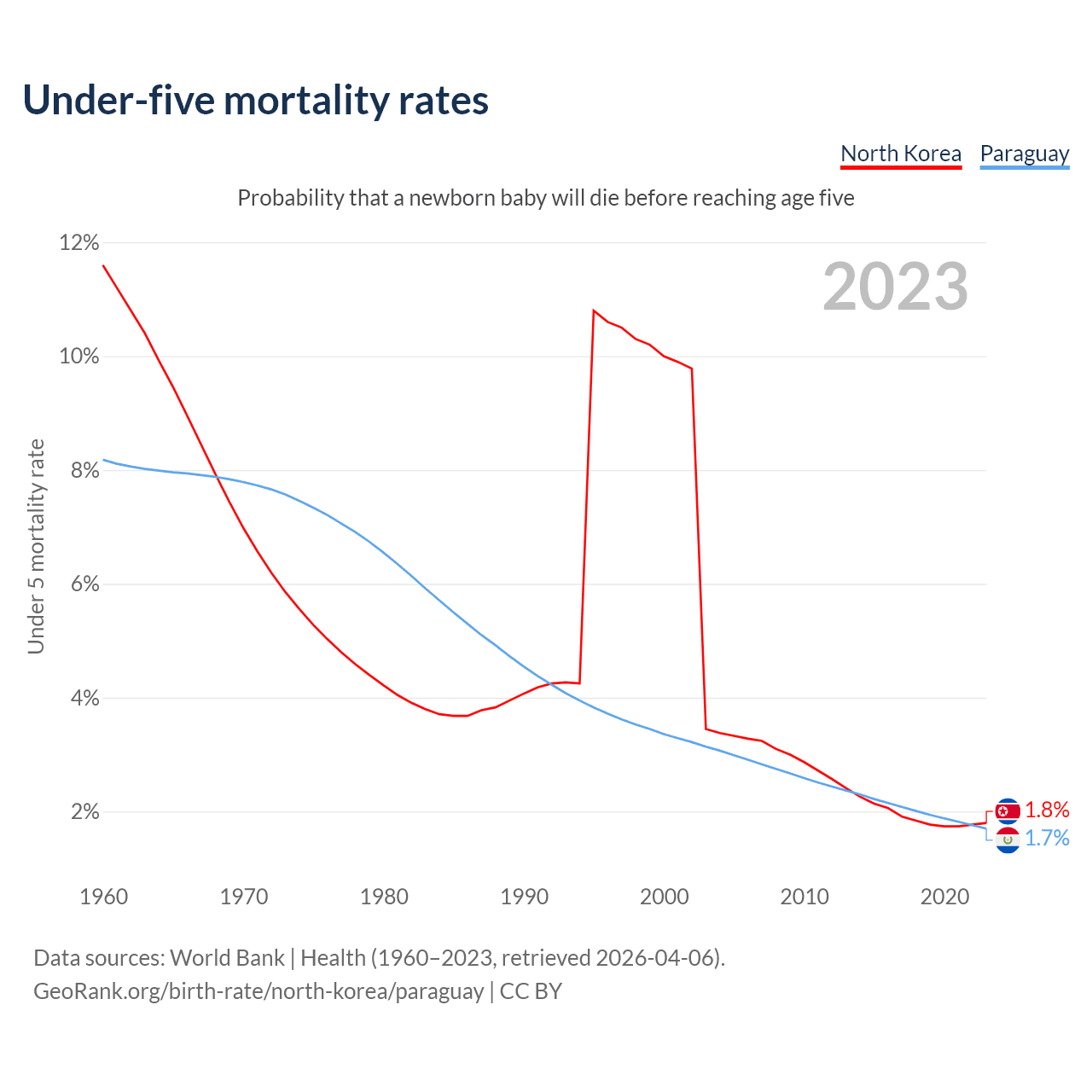 The chance that a newborn baby will die before reaching age five is 1.8% in North Korea and 1.7% in Paraguay. Above is a chart with historical data on under-five mortality rates.