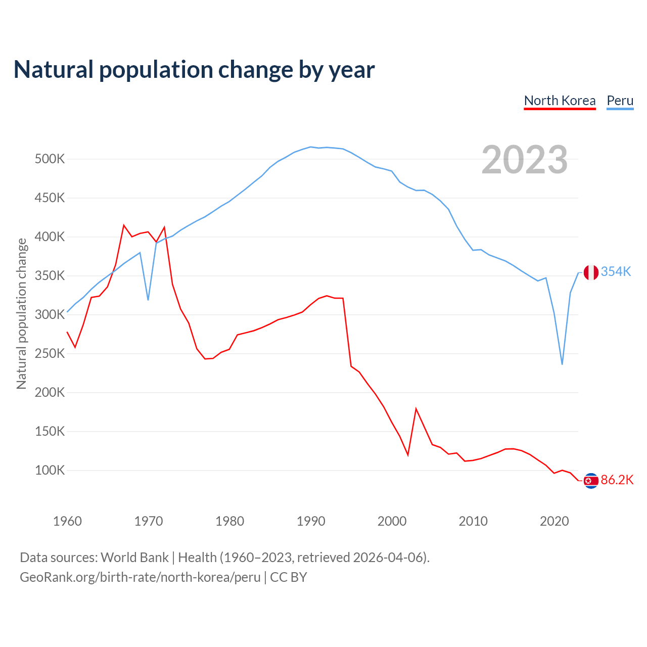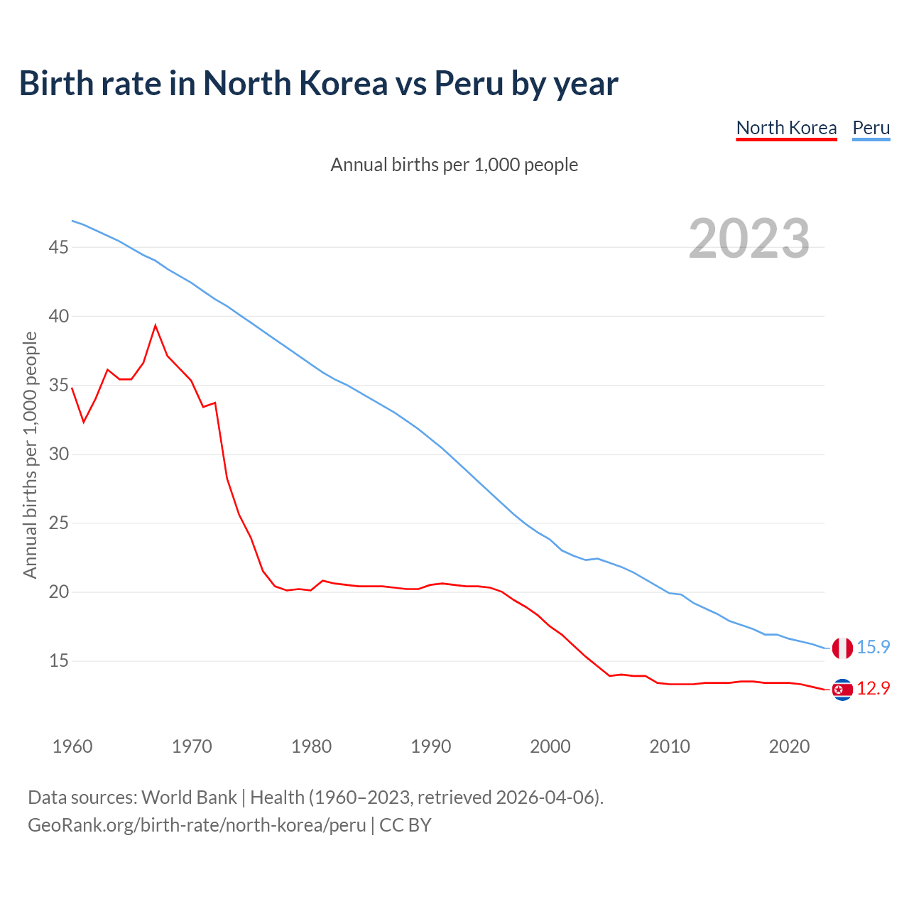 North Korea has an annual birth rate of 12.9 births per 1,000 people, compared to 15.9 for Peru. The average number of children a woman is expected to have during her lifetime — the fertility rate, is 1.78 in North Korea and 1.98 in Peru — 11.2% difference.