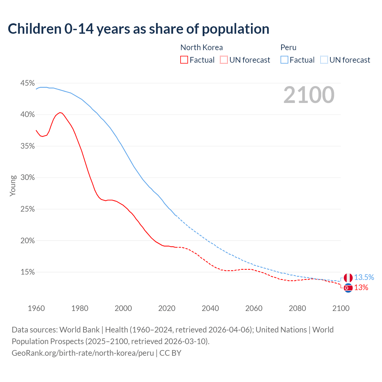 According to the latest available data on birth rates, the fertility rate in North Korea was 1.78 children per woman in 2023, compared to 1.98 in Peru in 2023. The replacement level is considered to be 2.1 children per woman.