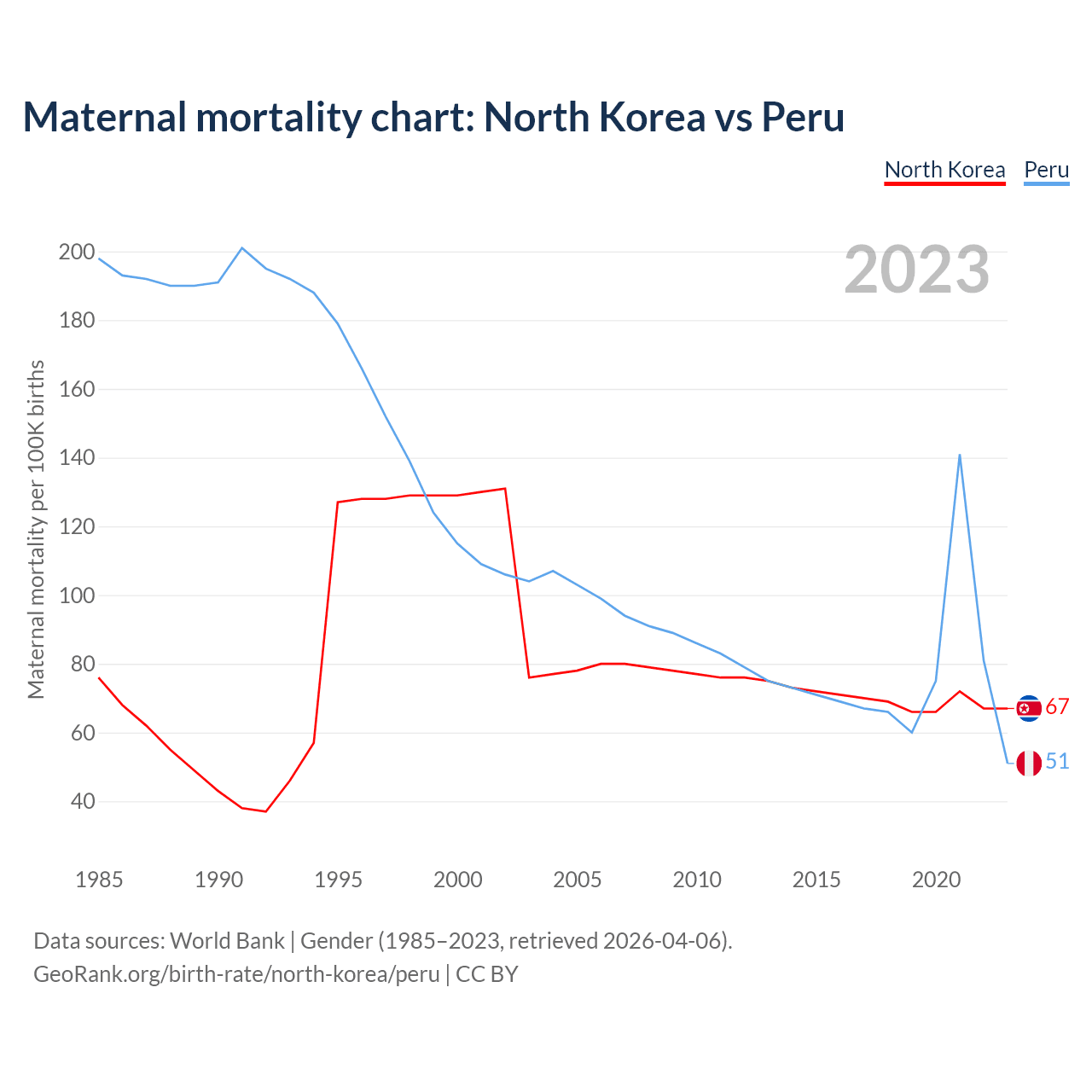 The maternal mortality rate, which is the probability of dying during childbirth or within 42 days of pregnancy termination, is 67 deaths per 100,000 live births in North Korea, compared to 51 deaths in Peru.