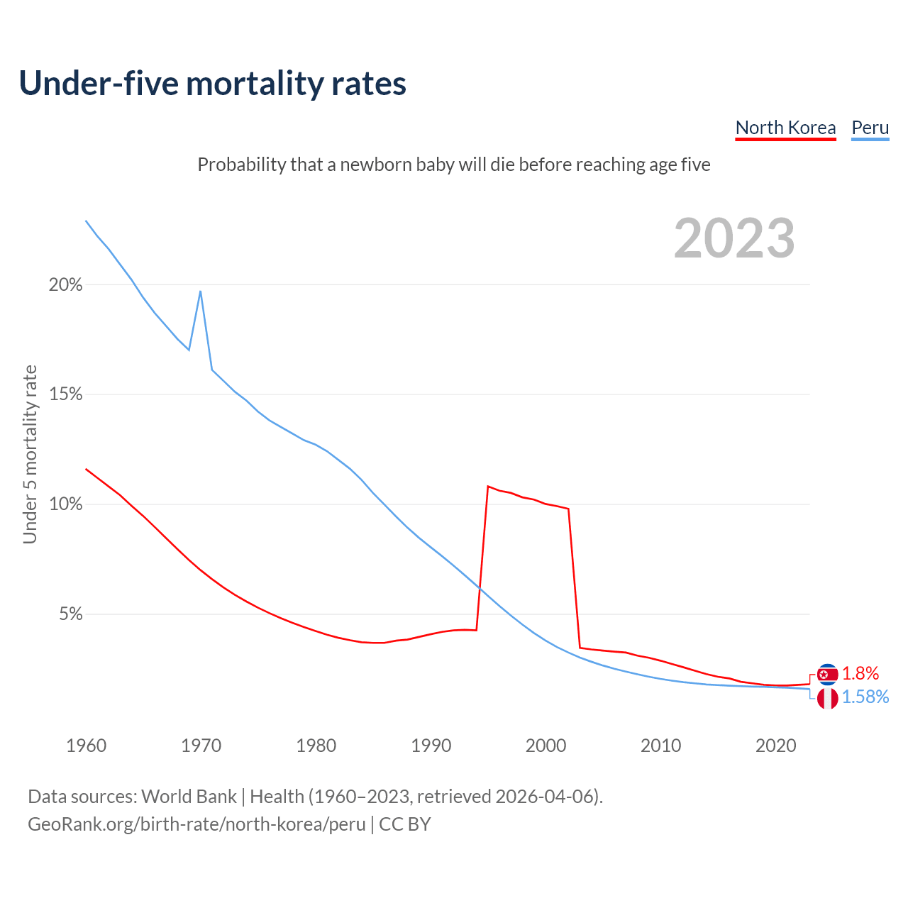 The chance that a newborn baby will die before reaching age five is 1.8% in North Korea and 1.58% in Peru. Above is a chart with historical data on under-five mortality rates.