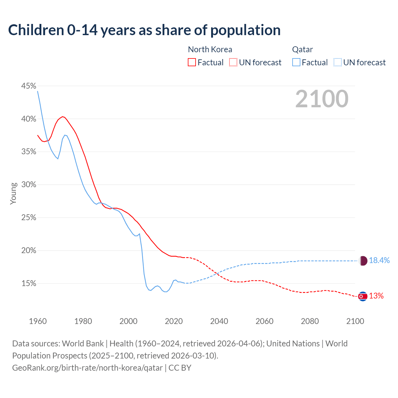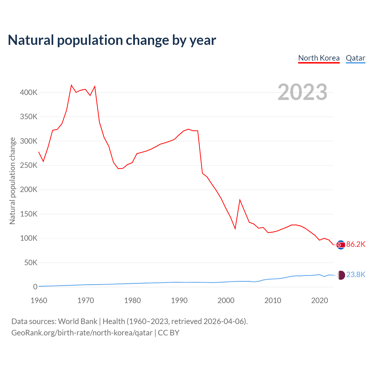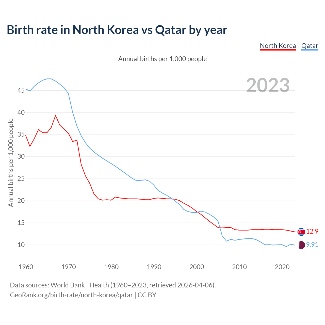North Korea has an annual birth rate of 12.9 births per 1,000 people, compared to 9.91 for Qatar. The average number of children a woman is expected to have during her lifetime — the fertility rate, is 1.78 in North Korea and 1.73 in Qatar — 2.87% difference.