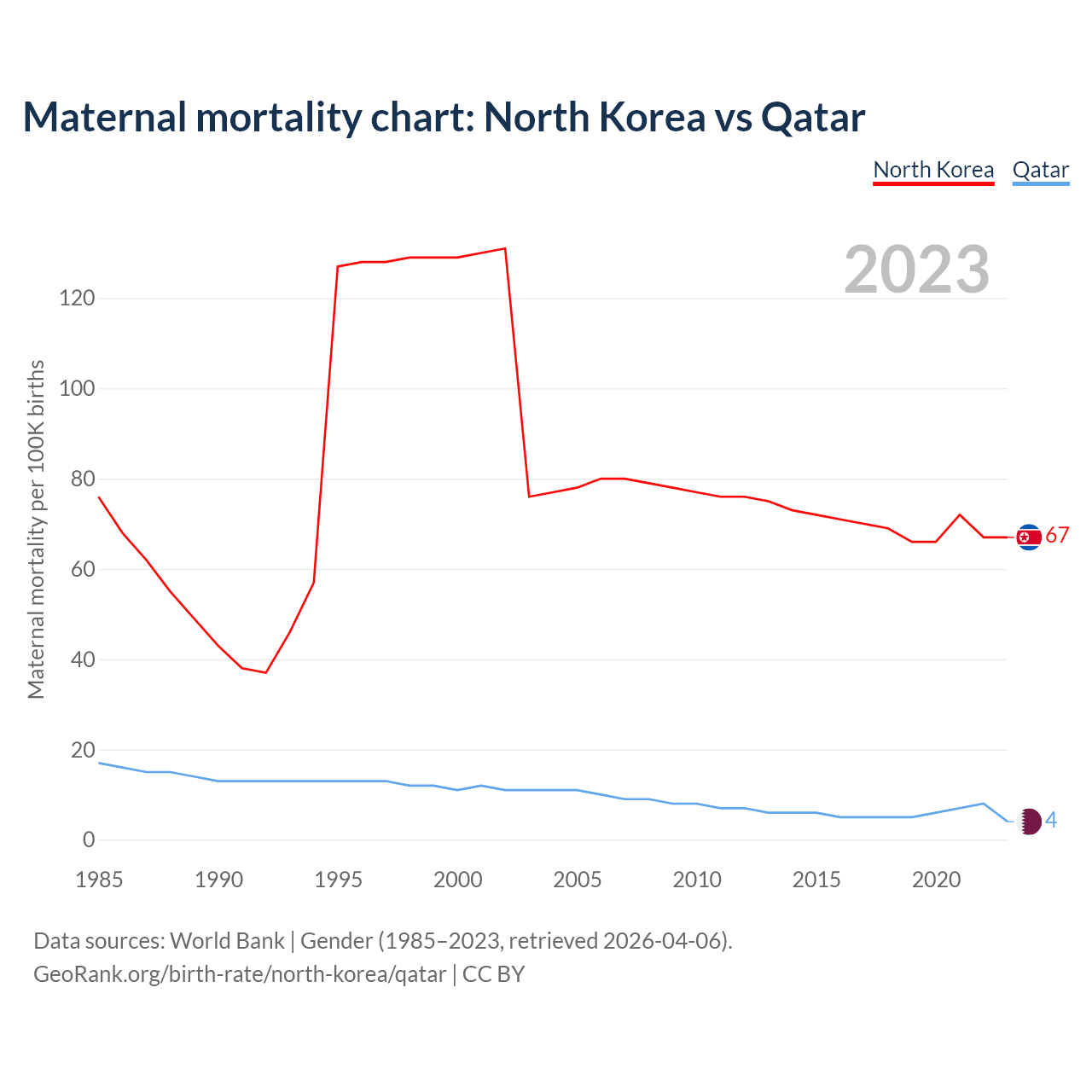 The maternal mortality rate, which is the probability of dying during childbirth or within 42 days of pregnancy termination, is 67 deaths per 100,000 live births in North Korea, compared to 4 deaths in Qatar.