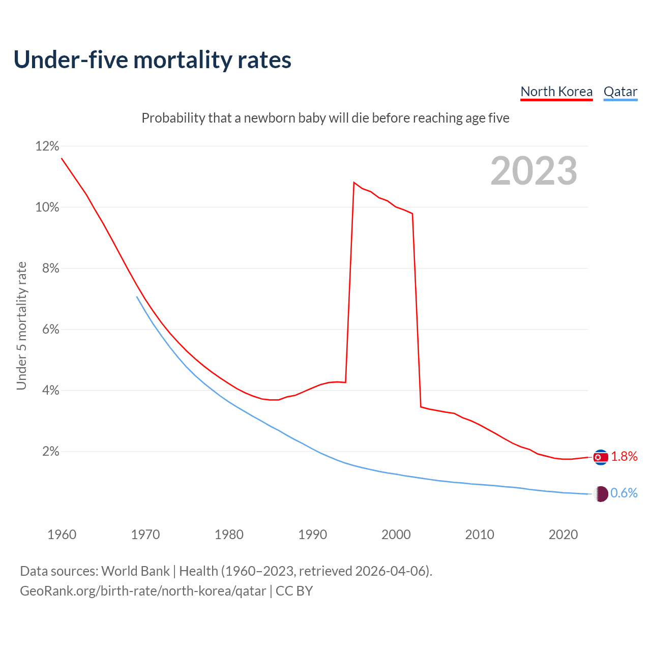 The chance that a newborn baby will die before reaching age five is 1.8% in North Korea and 0.6% in Qatar. Above is a chart with historical data on under-five mortality rates.