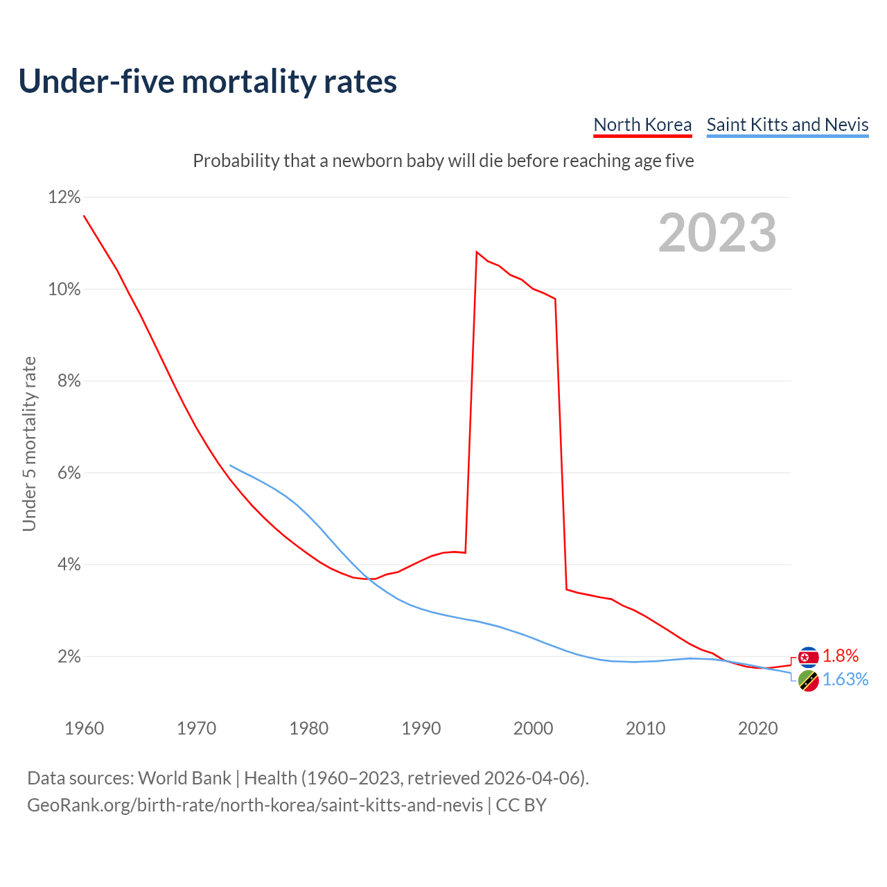 The chance that a newborn baby will die before reaching age five is 1.8% in North Korea and 1.63% in Saint Kitts and Nevis. Above is a chart with historical data on under-five mortality rates.