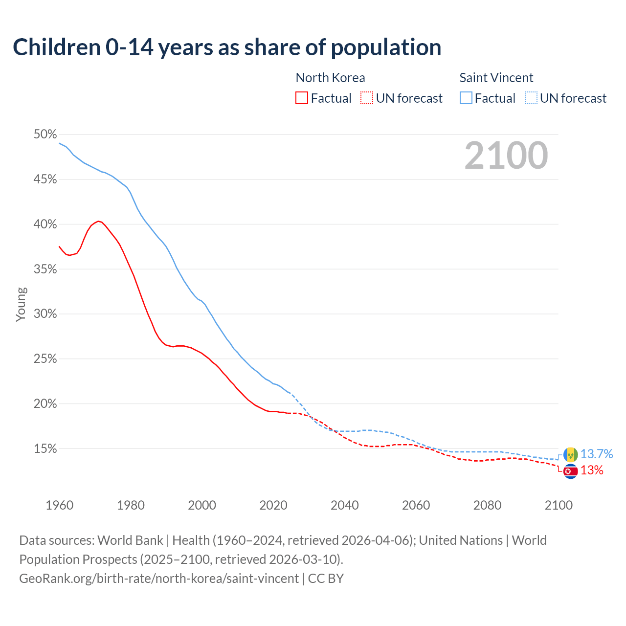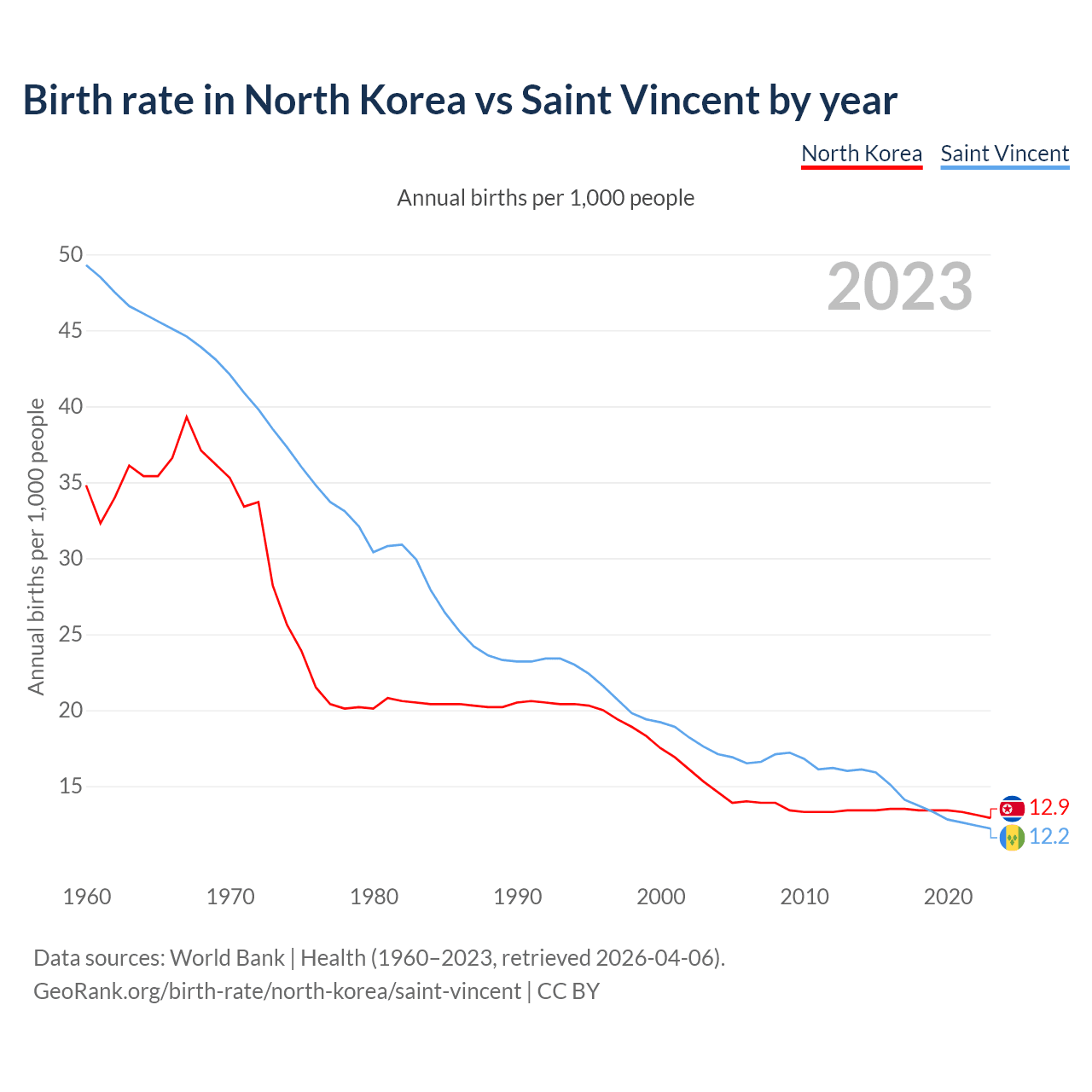 North Korea has an annual birth rate of 12.9 births per 1,000 people, compared to 12.2 for Saint Vincent. The average number of children a woman is expected to have during her lifetime — the fertility rate, is 1.78 in North Korea and 1.78 in Saint Vincent — 0.28% difference.