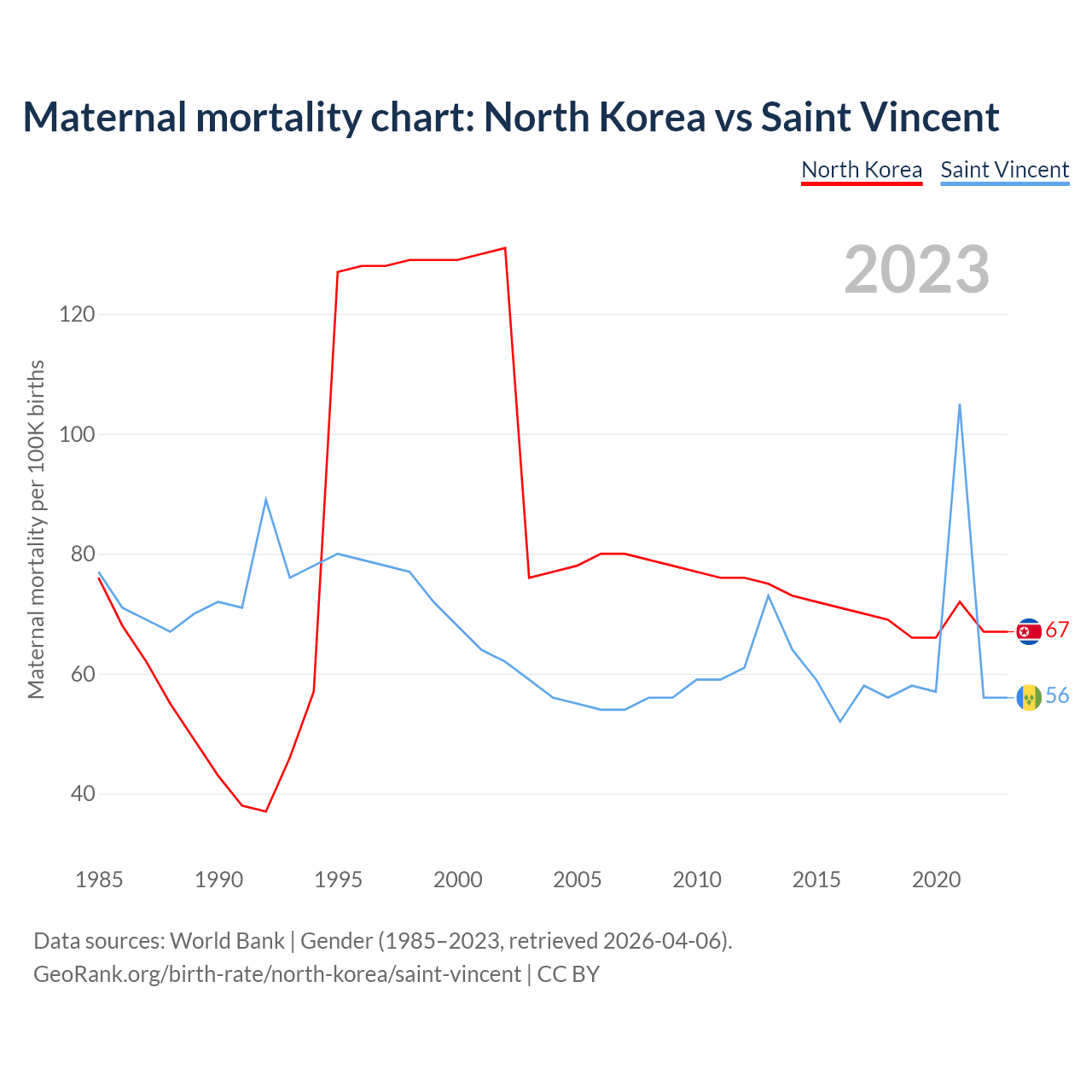 The maternal mortality rate, which is the probability of dying during childbirth or within 42 days of pregnancy termination, is 67 deaths per 100,000 live births in North Korea, compared to 56 deaths in Saint Vincent.