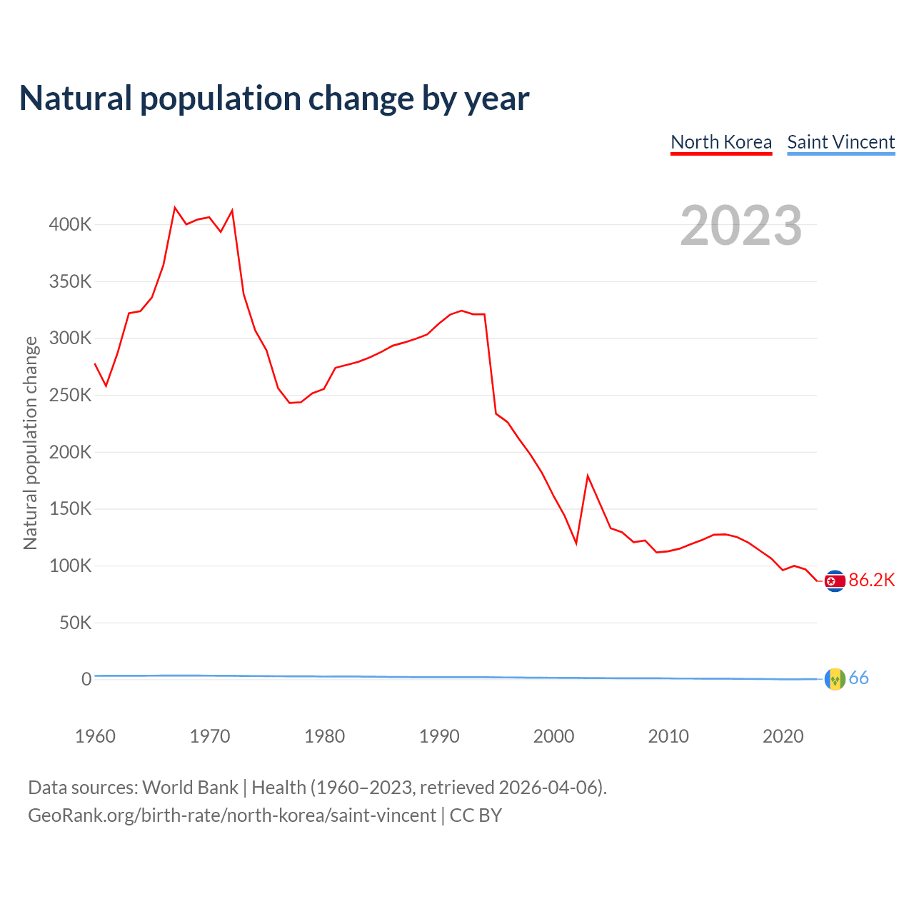 - North Korea is ranked 109/196 by birth rate compared to 116/196 for Saint Vincent.