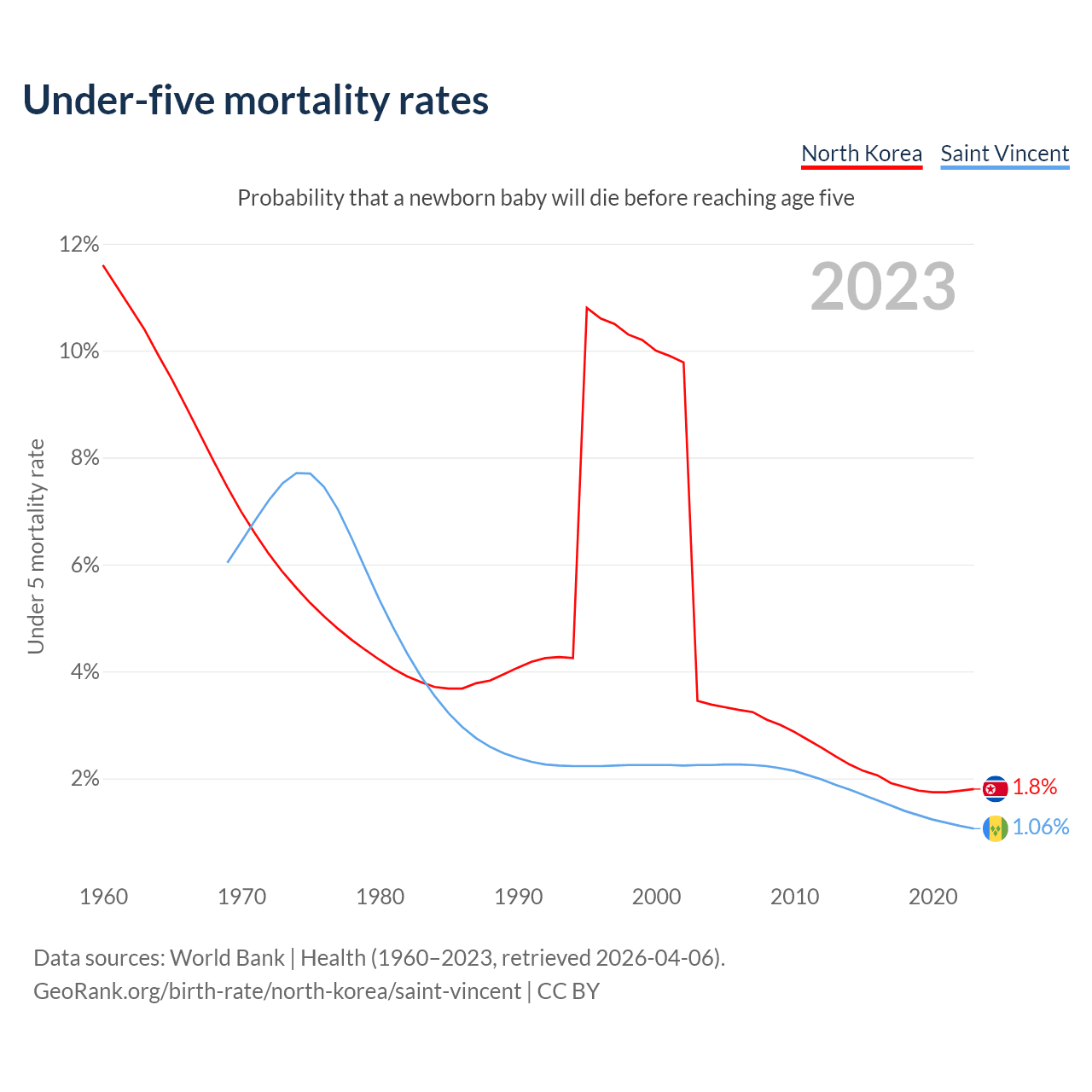 The chance that a newborn baby will die before reaching age five is 1.8% in North Korea and 1.06% in Saint Vincent. Above is a chart with historical data on under-five mortality rates.