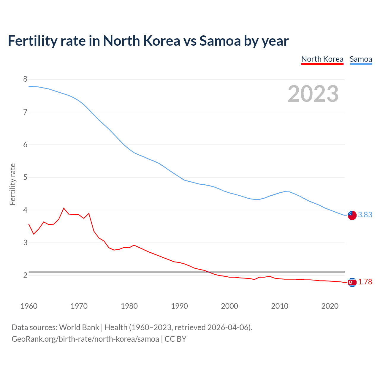 Fertility rate in North Korea vs Samoa by year