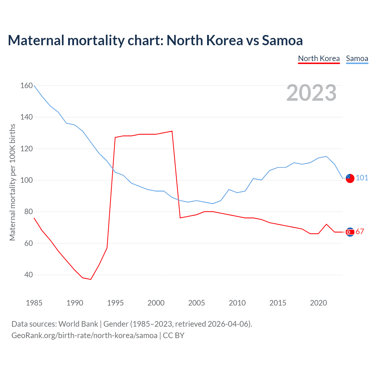 The maternal mortality rate, which is the probability of dying during childbirth or within 42 days of pregnancy termination, is 67 deaths per 100,000 live births in North Korea, compared to 101 deaths in Samoa.