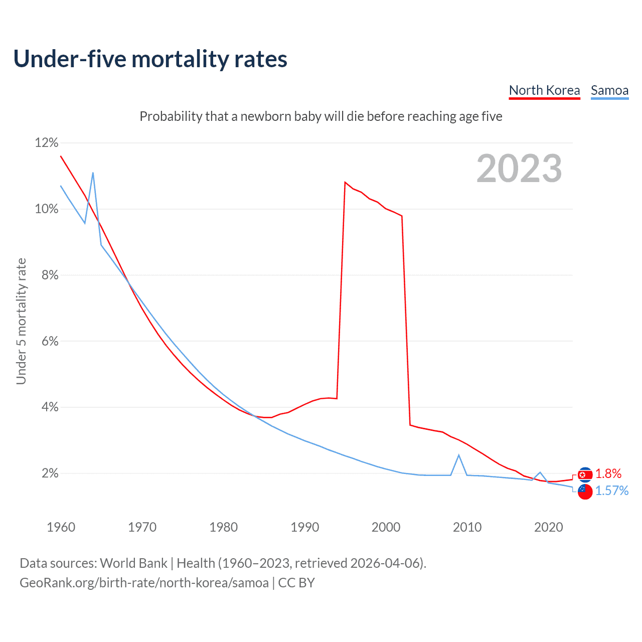 The chance that a newborn baby will die before reaching age five is 1.8% in North Korea and 1.57% in Samoa. Above is a chart with historical data on under-five mortality rates.