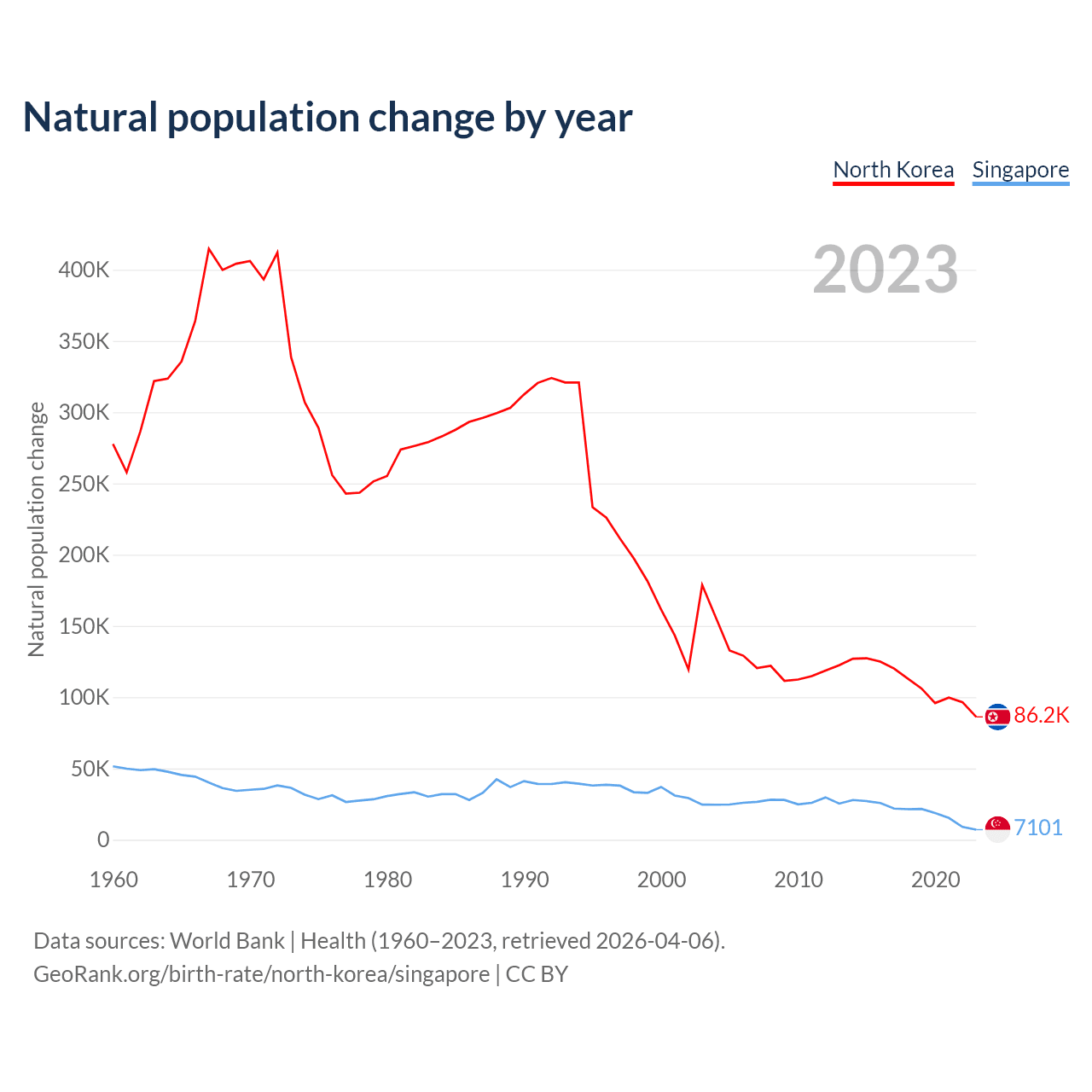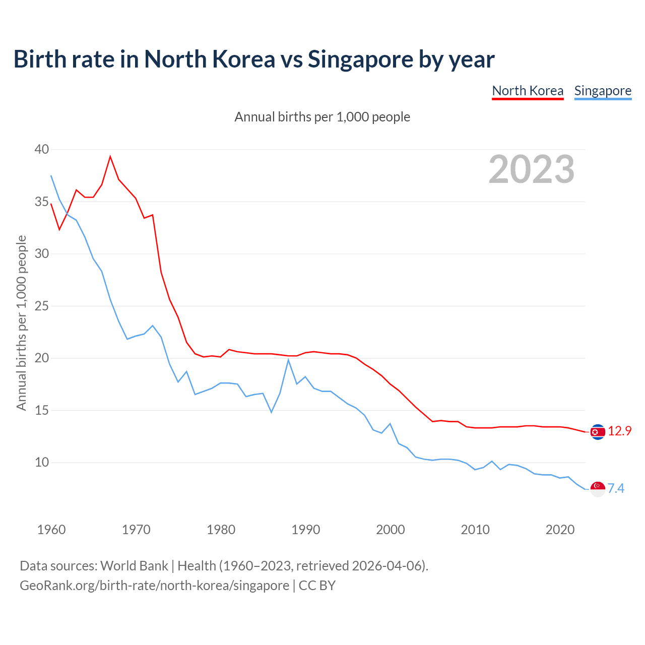 North Korea has an annual birth rate of 12.9 births per 1,000 people, compared to 7.4 for Singapore. The average number of children a woman is expected to have during her lifetime — the fertility rate, is 1.78 in North Korea and 0.97 in Singapore — 45.5% difference.