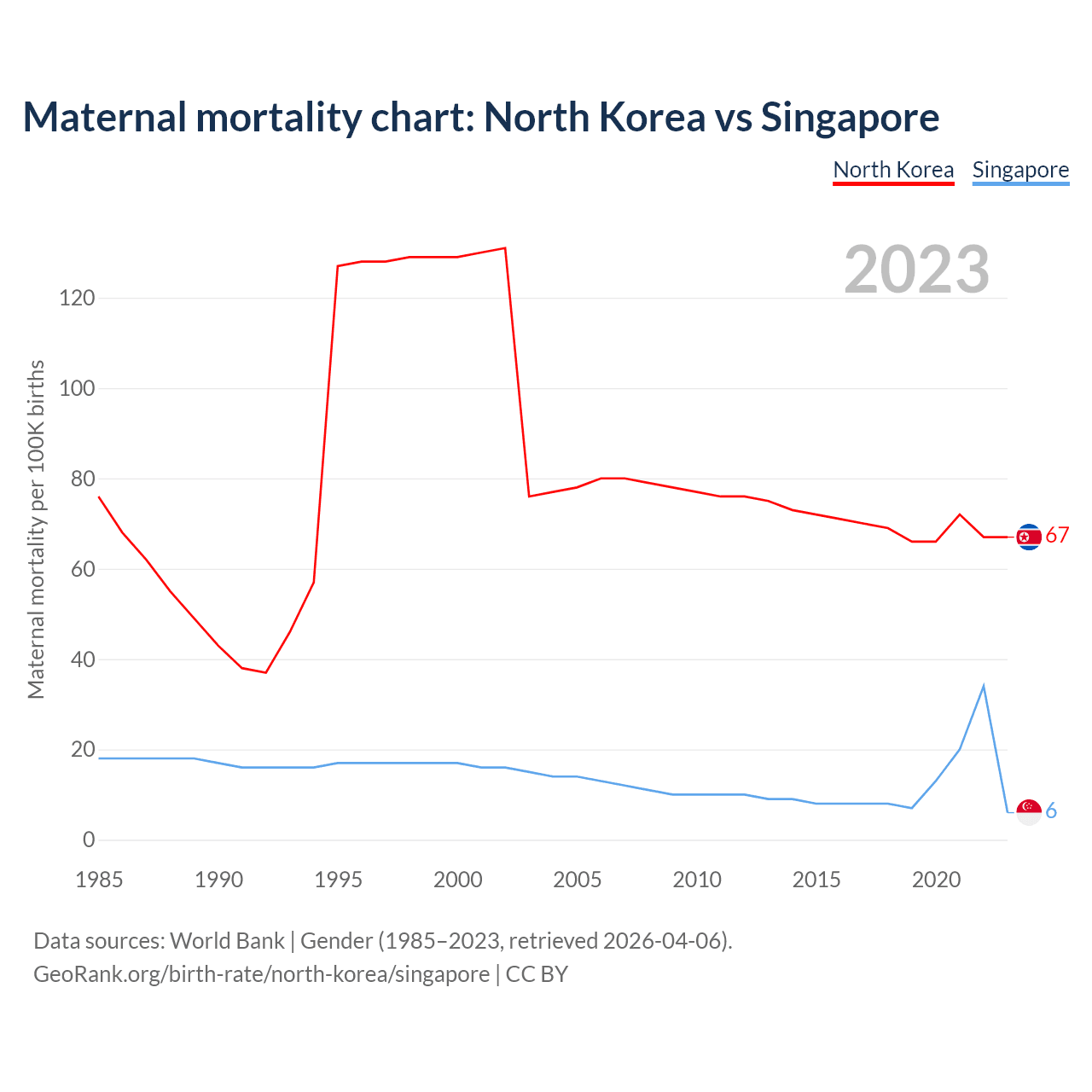 The maternal mortality rate, which is the probability of dying during childbirth or within 42 days of pregnancy termination, is 67 deaths per 100,000 live births in North Korea, compared to 6 deaths in Singapore.