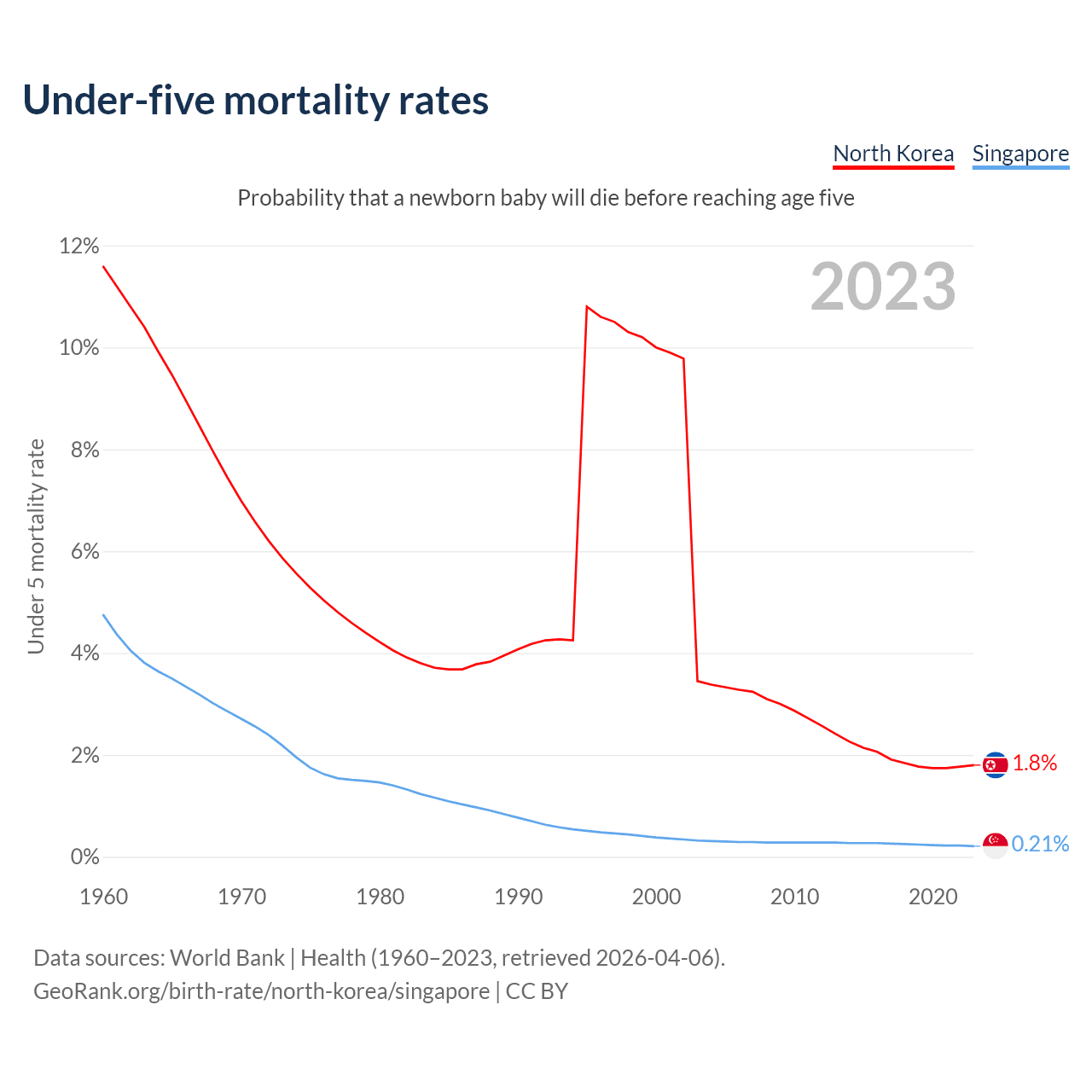 The chance that a newborn baby will die before reaching age five is 1.8% in North Korea and 0.21% in Singapore. Above is a chart with historical data on under-five mortality rates.