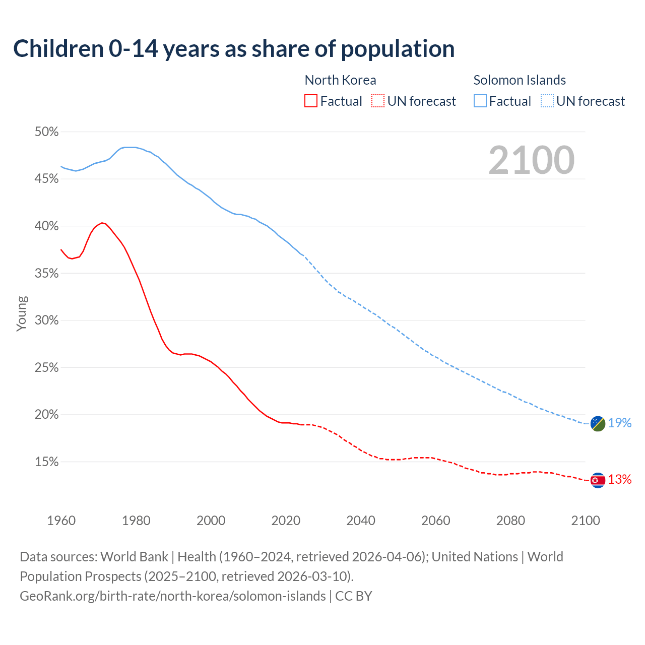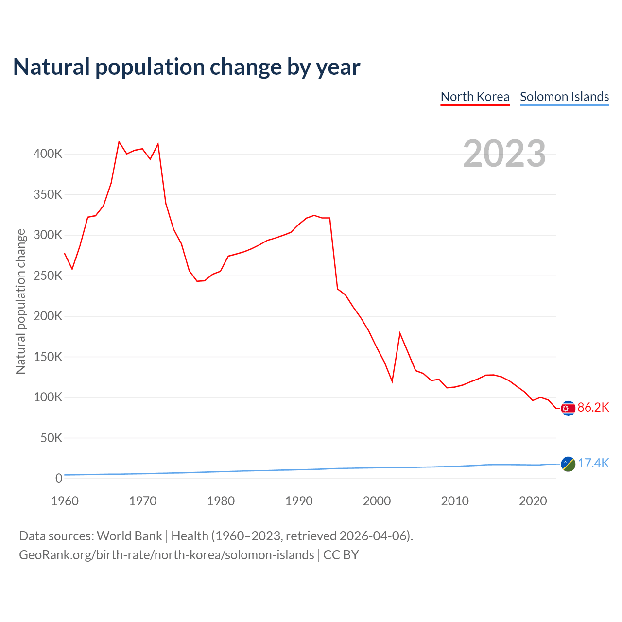 North Korea has an annual birth rate of 12.9 births per 1,000 people, compared to 26.9 for the Solomon Islands. The average number of children a woman is expected to have during her lifetime — the fertility rate, is 1.78 in North Korea and 3.56 in the Solomon Islands — 99.8% difference.