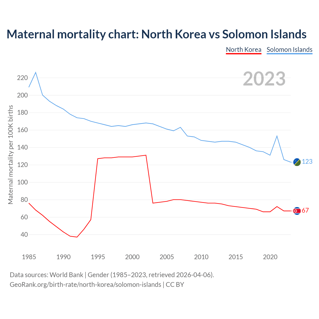 The maternal mortality rate, which is the probability of dying during childbirth or within 42 days of pregnancy termination, is 67 deaths per 100,000 live births in North Korea, compared to 123 deaths in the Solomon Islands.