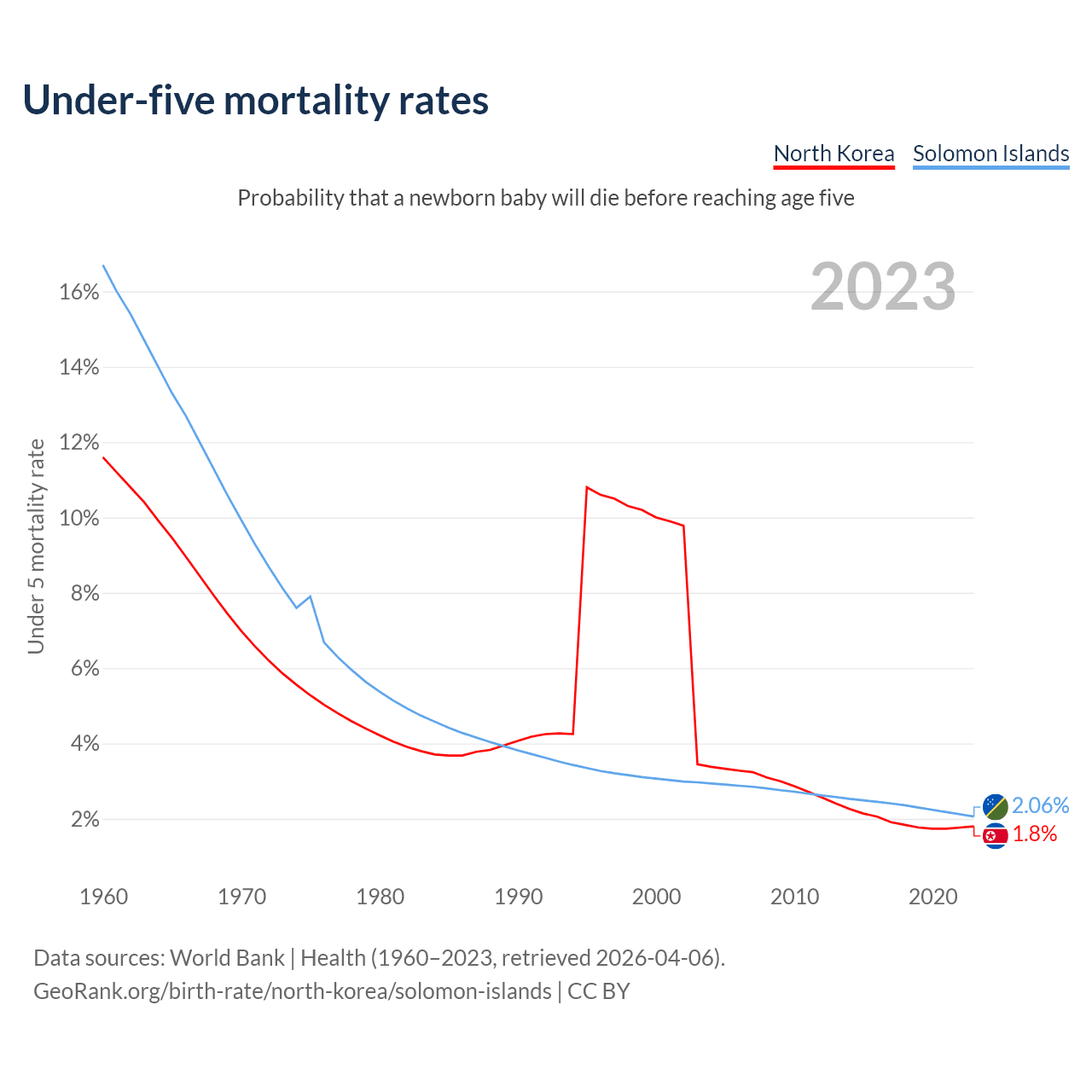 The chance that a newborn baby will die before reaching age five is 1.8% in North Korea and 2.06% in the Solomon Islands. Above is a chart with historical data on under-five mortality rates.