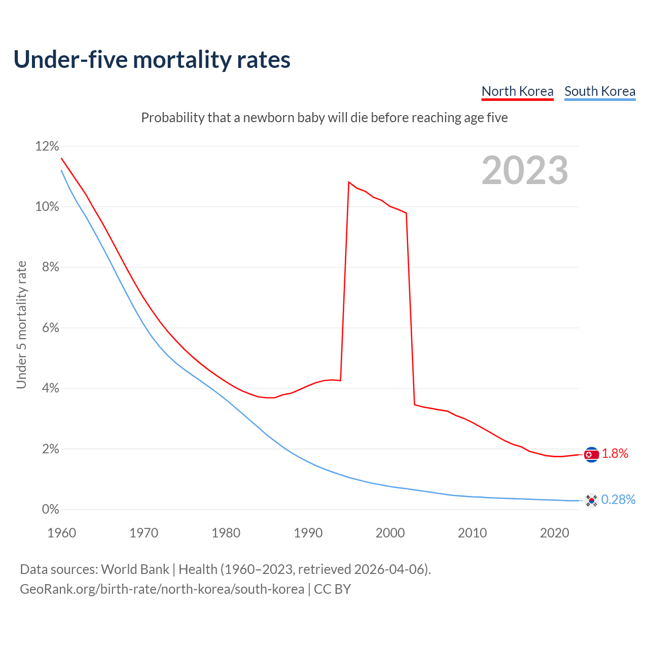 The chance that a newborn baby will die before reaching age five is 1.8% in North Korea and 0.28% in South Korea. Above is a chart with historical data on under-five mortality rates.