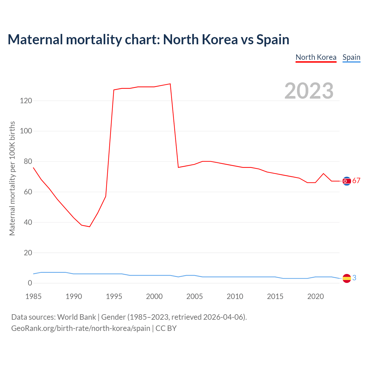 The maternal mortality rate, which is the probability of dying during childbirth or within 42 days of pregnancy termination, is 67 deaths per 100,000 live births in North Korea, compared to 3 deaths in Spain.