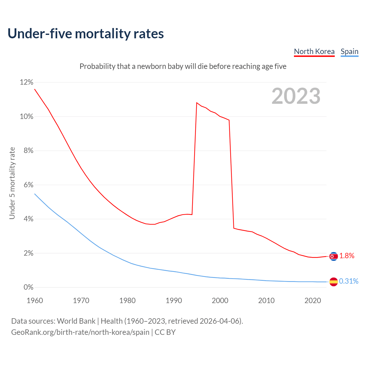 The chance that a newborn baby will die before reaching age five is 1.8% in North Korea and 0.31% in Spain. Above is a chart with historical data on under-five mortality rates.
