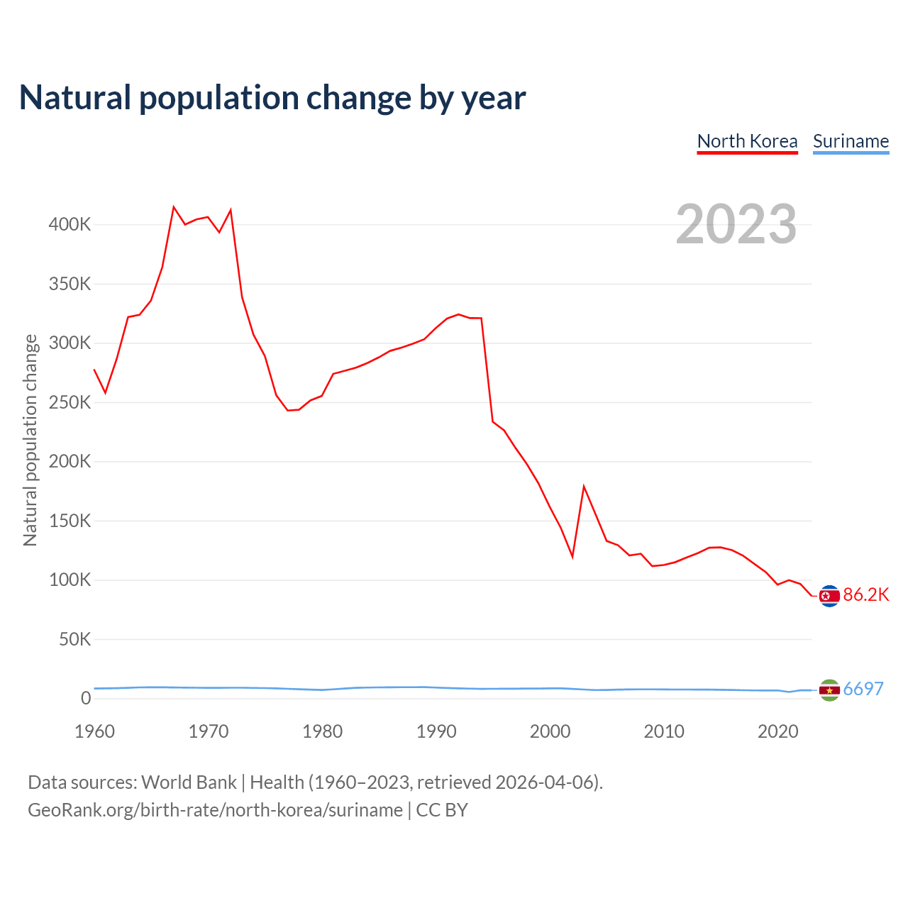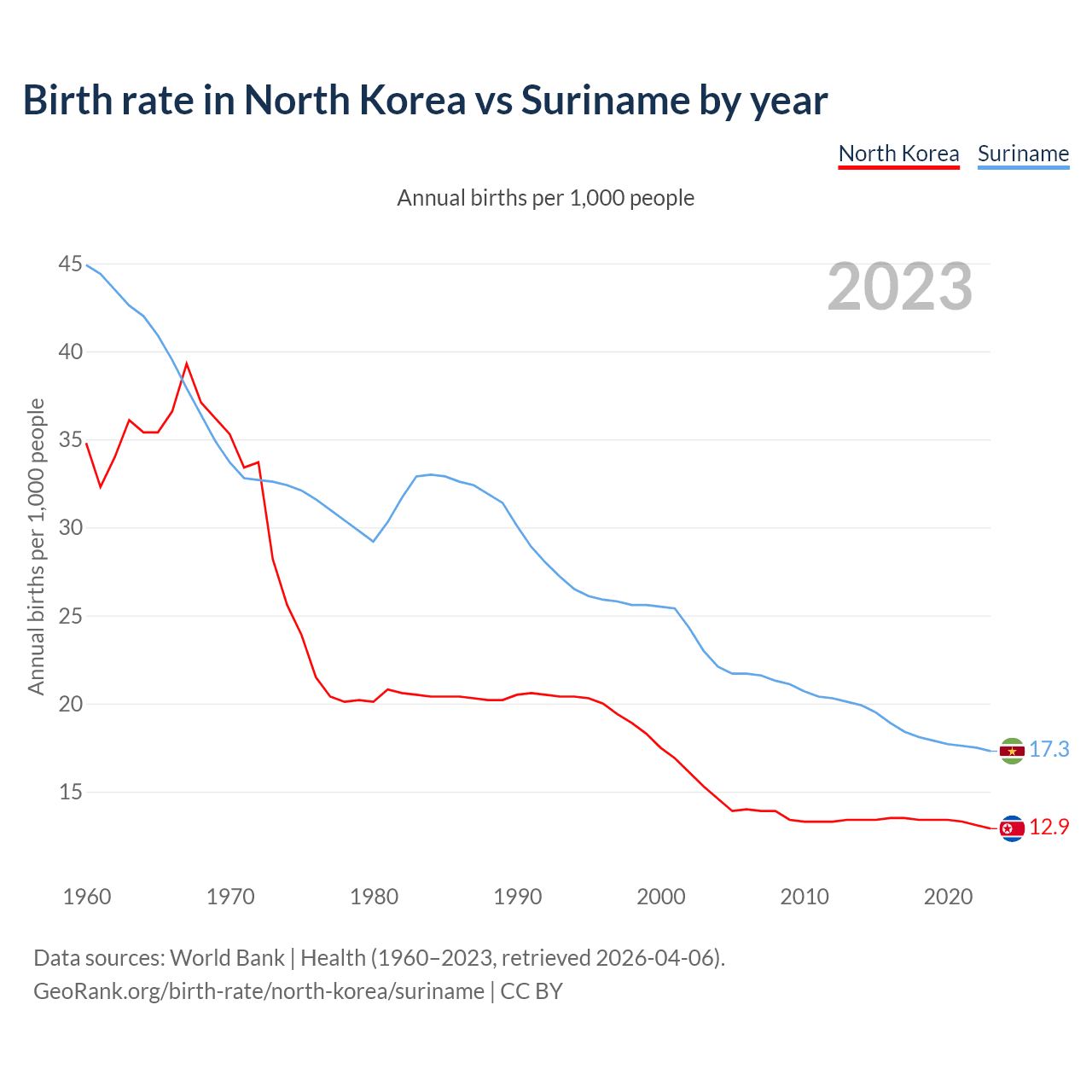 North Korea has an annual birth rate of 12.9 births per 1,000 people, compared to 17.3 for Suriname. The average number of children a woman is expected to have during her lifetime — the fertility rate, is 1.78 in North Korea and 2.25 in Suriname — 26.3% difference.