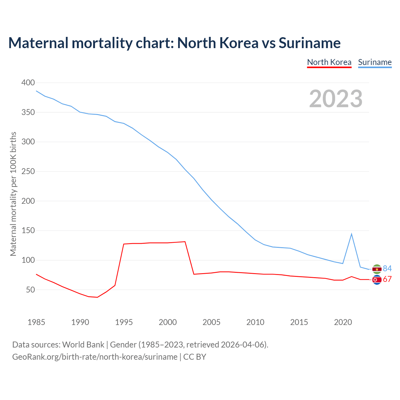 The maternal mortality rate, which is the probability of dying during childbirth or within 42 days of pregnancy termination, is 67 deaths per 100,000 live births in North Korea, compared to 84 deaths in Suriname.