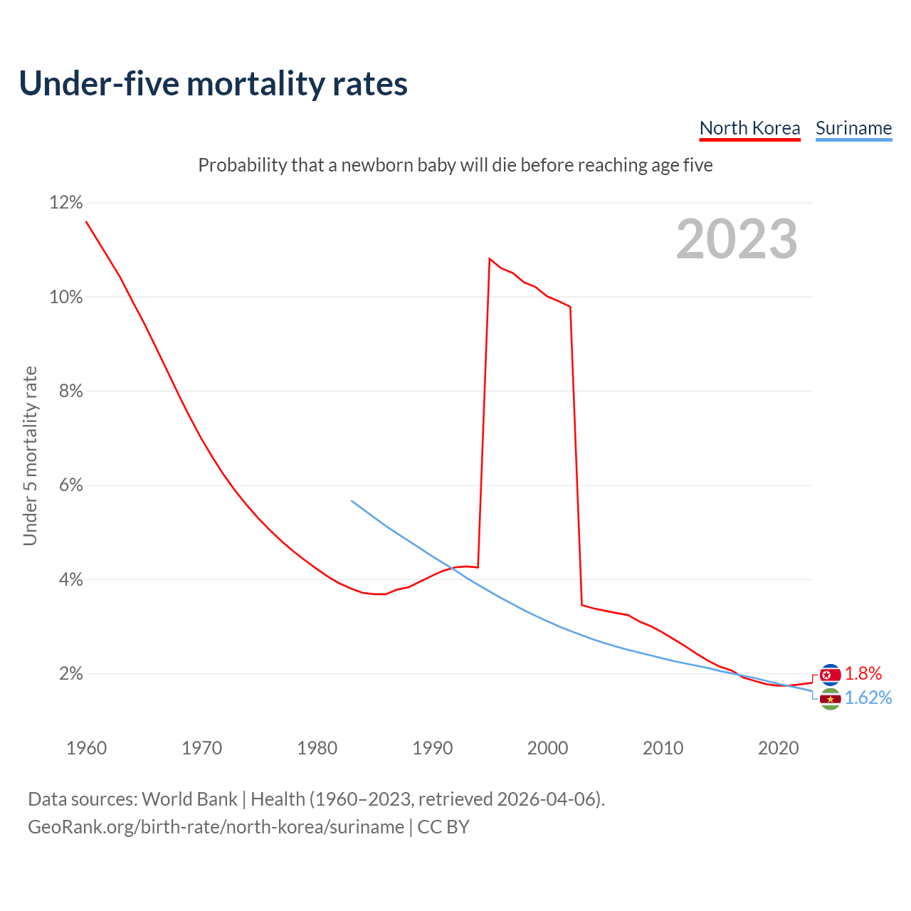The chance that a newborn baby will die before reaching age five is 1.8% in North Korea and 1.62% in Suriname. Above is a chart with historical data on under-five mortality rates.