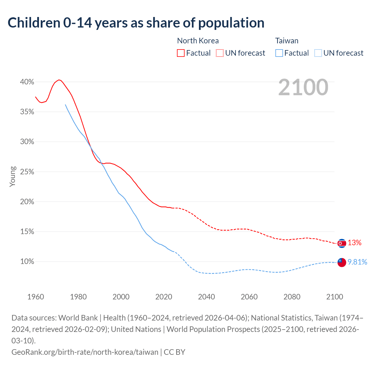 Children aged 0-14 make up 18.9% of the population in North Korea and 11.7% in Taiwan in 2024, compared to 26.5% and 27.1% respectively in 1990.
