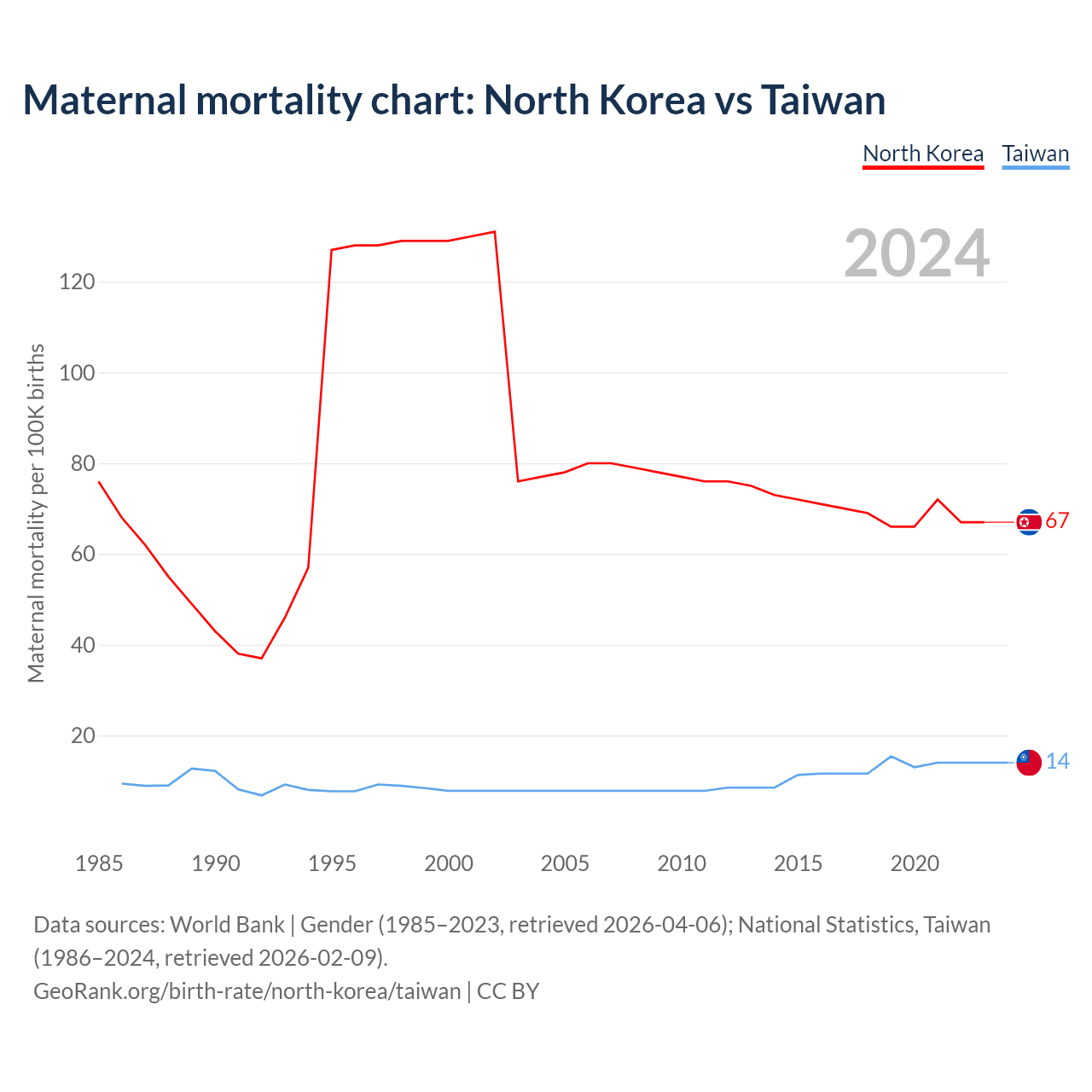 The maternal mortality rate, which is the probability of dying during childbirth or within 42 days of pregnancy termination, is 67 deaths per 100,000 live births in North Korea, compared to 14 deaths in Taiwan.