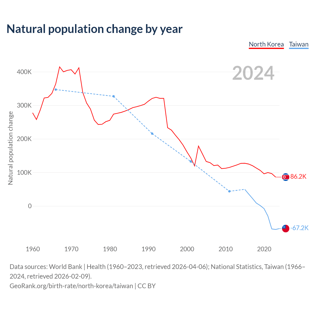 North Korea has an annual birth rate of 12.9 births per 1,000 people, compared to 5.76 for Taiwan. The average number of children a woman is expected to have during her lifetime — the fertility rate, is 1.78 in North Korea and 0.89 in Taiwan — 50.3% difference.