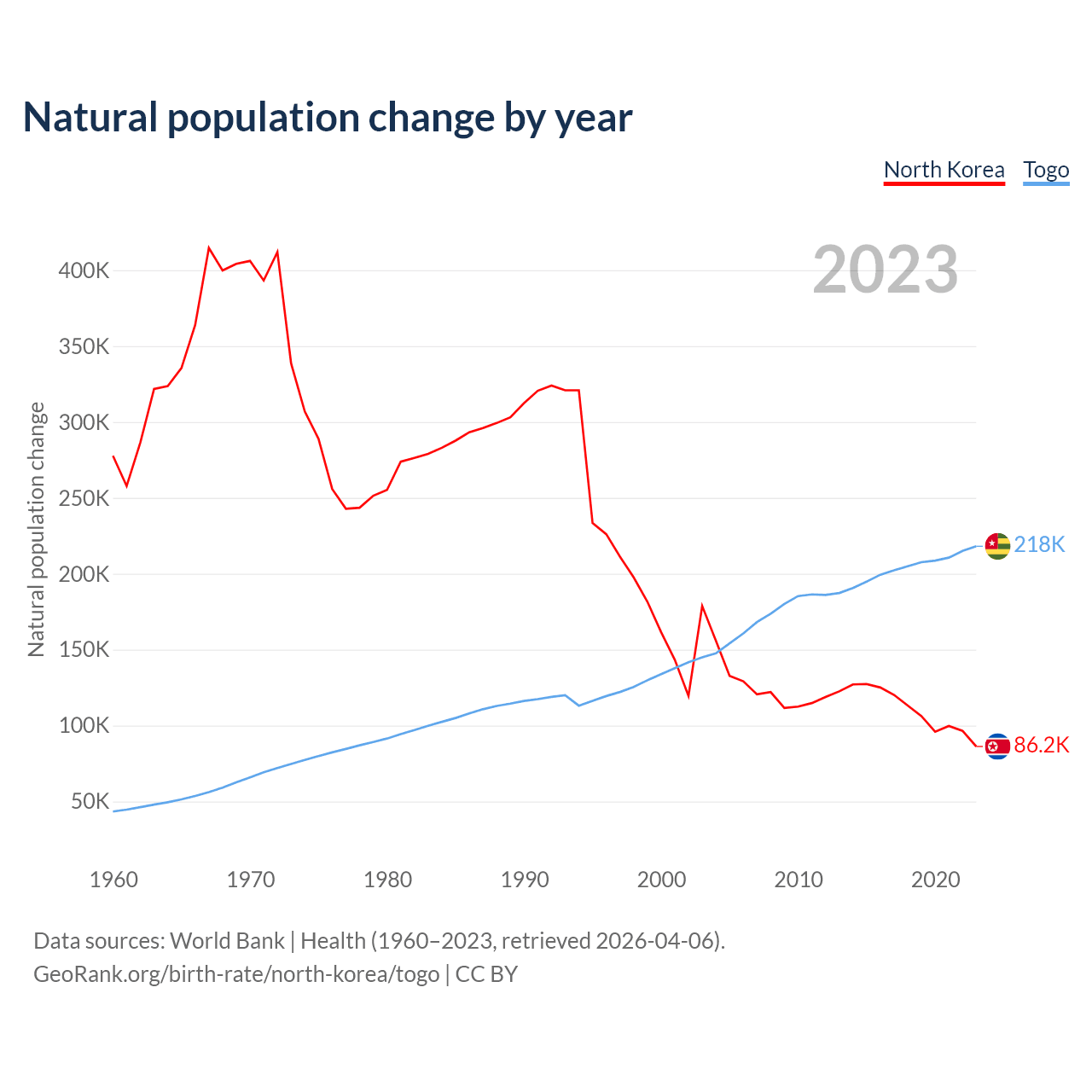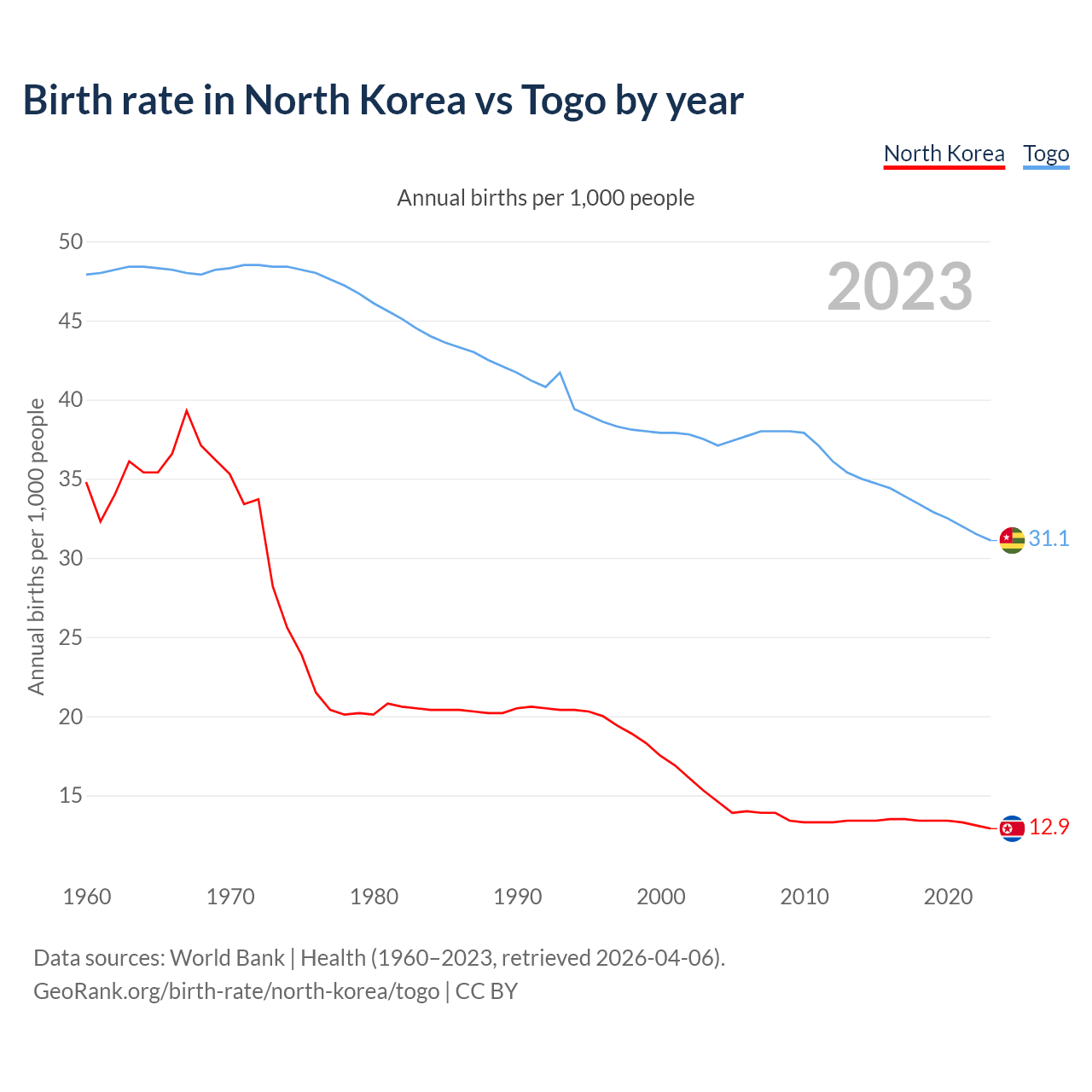 North Korea has an annual birth rate of 12.9 births per 1,000 people, compared to 31.1 for Togo. The average number of children a woman is expected to have during her lifetime — the fertility rate, is 1.78 in North Korea and 4.19 in Togo — 135.5% difference.