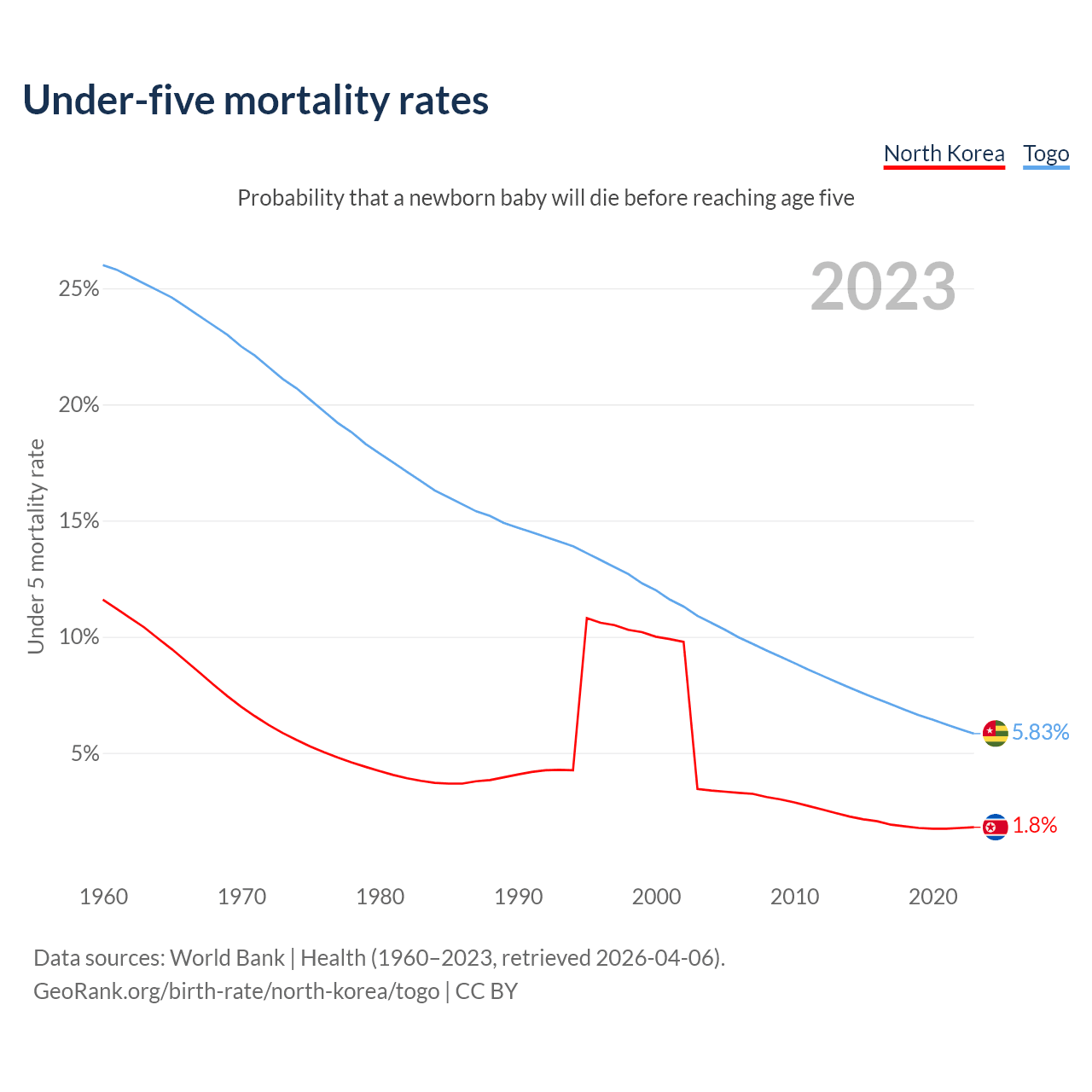 The chance that a newborn baby will die before reaching age five is 1.8% in North Korea and 5.83% in Togo. Above is a chart with historical data on under-five mortality rates.