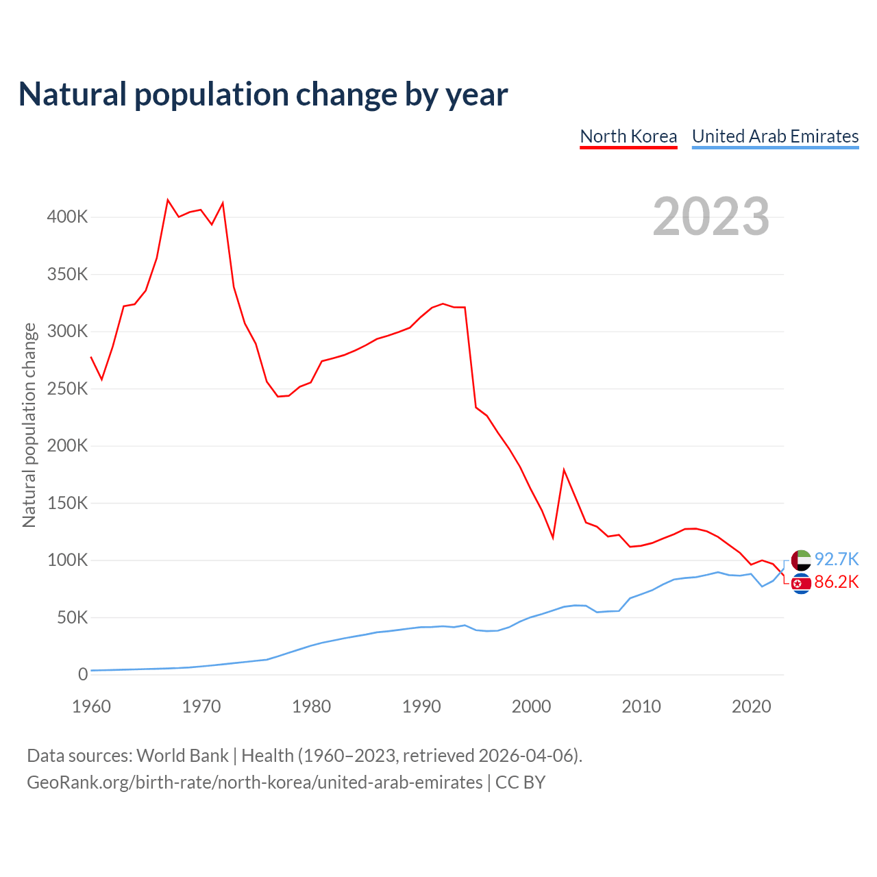 1960 vs 2023, the fertility rate has decreased by 50.1% in North Korea and by 81.5% in the United Arab Emirates — in 1960, it was 3.57 and 6.5, respectively.