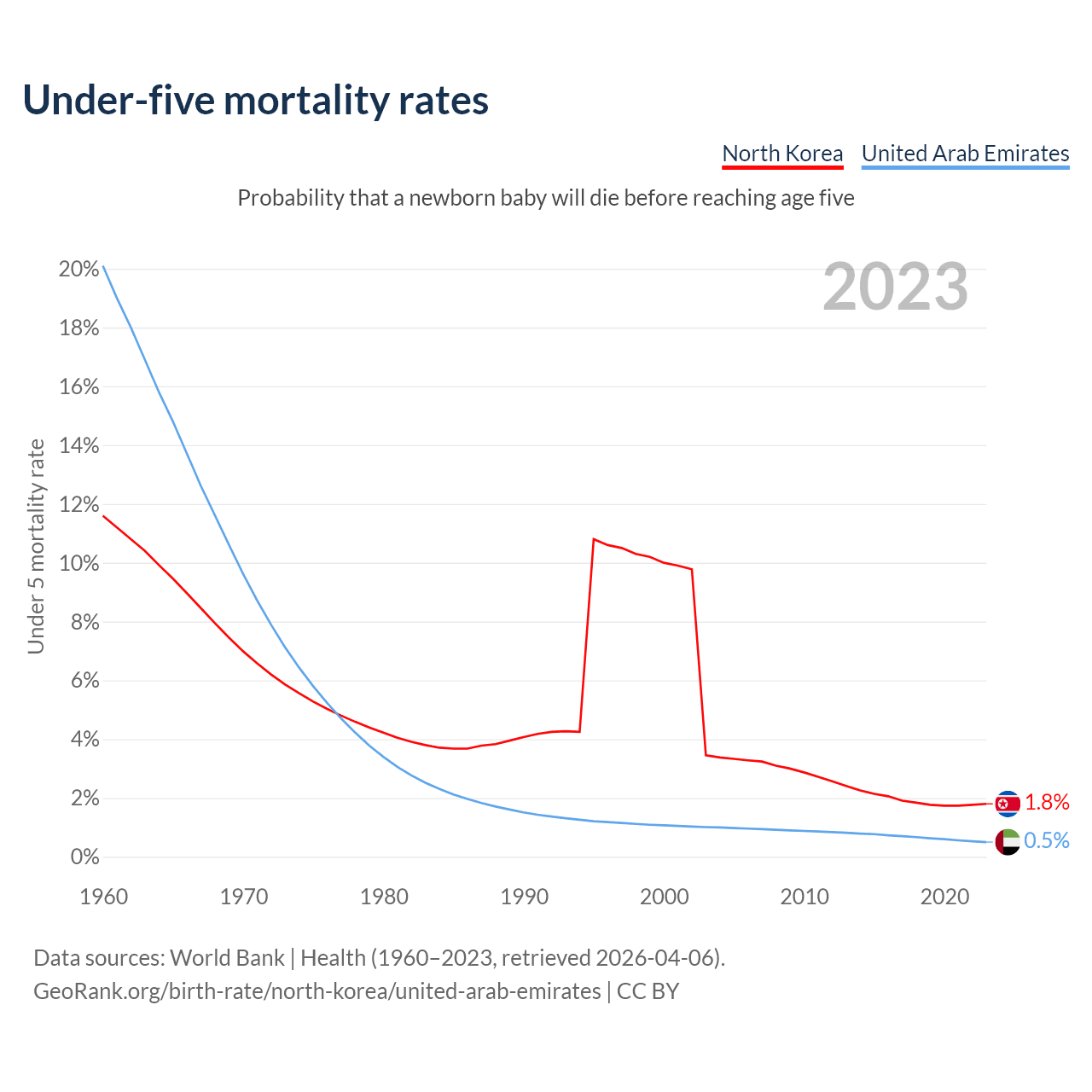 The chance that a newborn baby will die before reaching age five is 1.8% in North Korea and 0.5% in the United Arab Emirates. Above is a chart with historical data on under-five mortality rates.