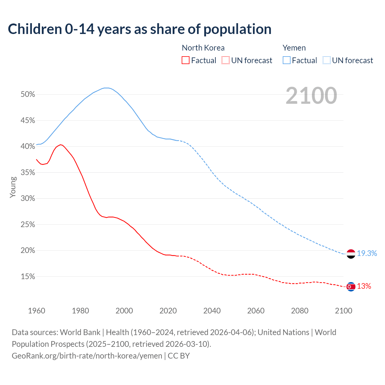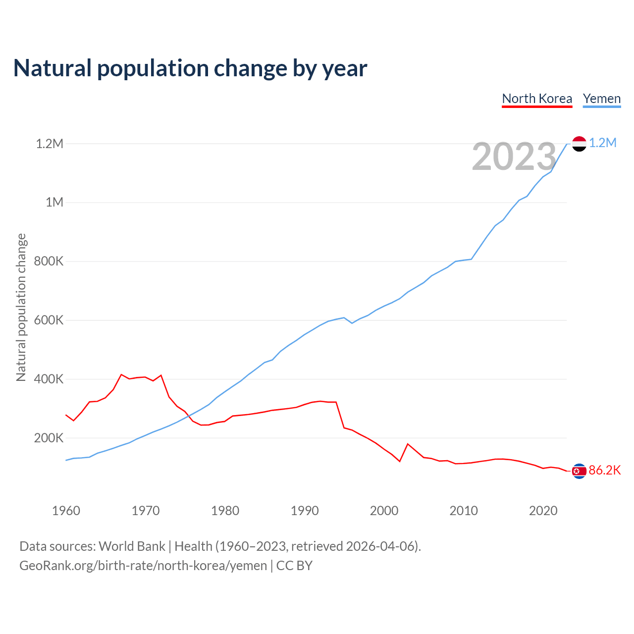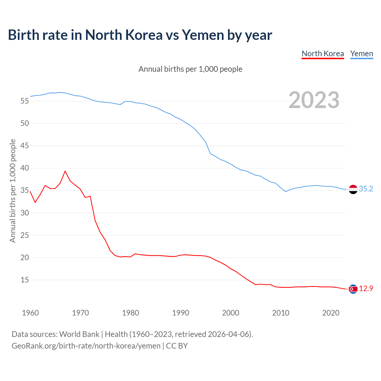 North Korea has an annual birth rate of 12.9 births per 1,000 people, compared to 35.2 for Yemen. The average number of children a woman is expected to have during her lifetime — the fertility rate, is 1.78 in North Korea and 4.59 in Yemen — 157.9% difference.