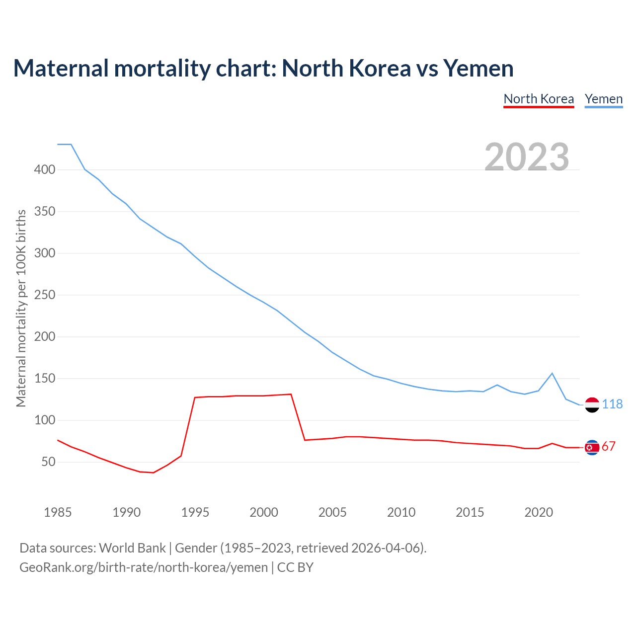 The maternal mortality rate, which is the probability of dying during childbirth or within 42 days of pregnancy termination, is 67 deaths per 100,000 live births in North Korea, compared to 118 deaths in Yemen.