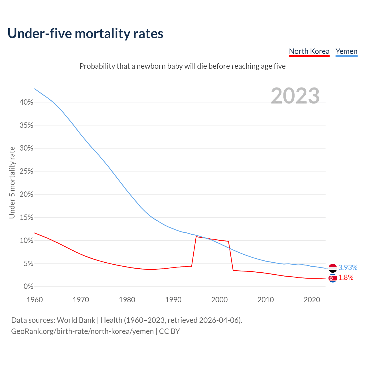 The chance that a newborn baby will die before reaching age five is 1.8% in North Korea and 3.93% in Yemen. Above is a chart with historical data on under-five mortality rates.