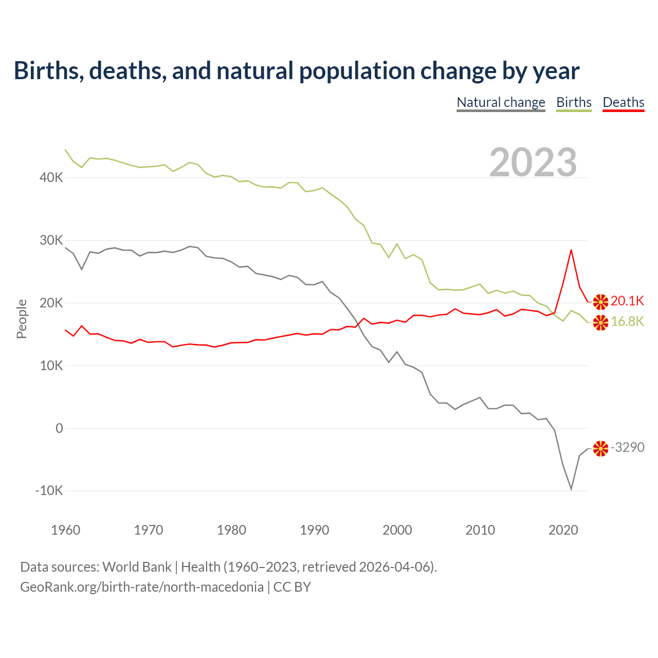 According to the latest birth rate data available, the fertility rate in North Macedonia was 1.5 in 2023 and has been below the replacement level of 2.1 children per woman since 1996. In 1993, the fertility rate was 2.26 — a 33.6% decline in 30 years.
