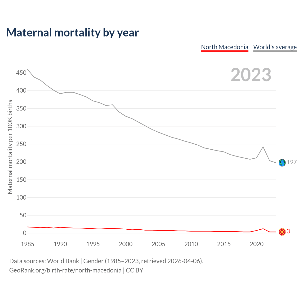 The maternal mortality rate in North Macedonia was 3 deaths per 100,000 live births in 2023 — a 0.003% chance of dying during childbirth or within 42 days of pregnancy termination. This is a 72.7% decrease compared to the year 2000.