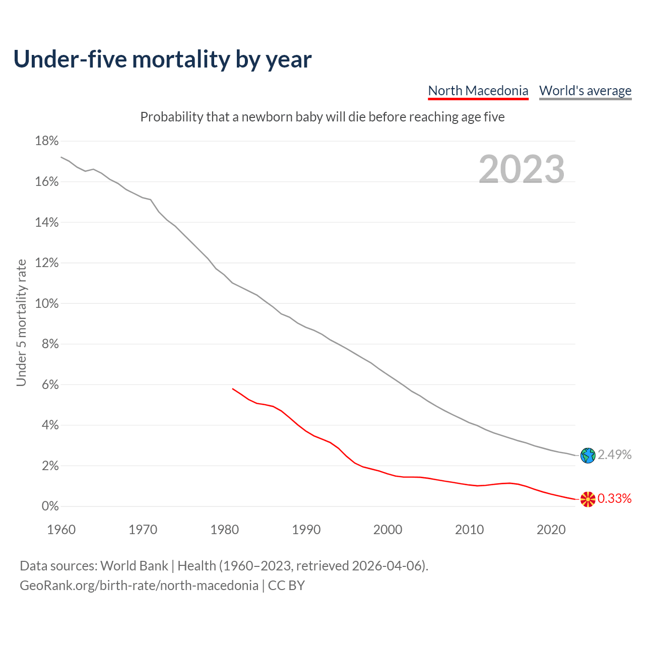 The under-5 mortality rate in North Macedonia was 3.3 deaths per 1,000 live births in 2023 — a 0.33% chance that a newborn baby will die before reaching age five. This is down from 15.9 deaths per 1,000 live births in 2000.