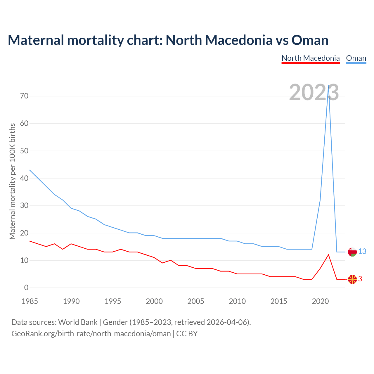 The maternal mortality rate, which is the probability of dying during childbirth or within 42 days of pregnancy termination, is 3 deaths per 100,000 live births in North Macedonia, compared to 13 deaths in Oman.