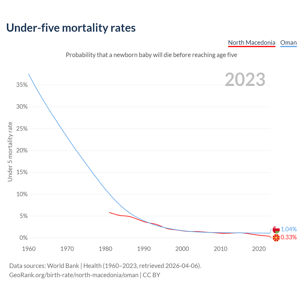 The chance that a newborn baby will die before reaching age five is 0.33% in North Macedonia and 1.04% in Oman. Above is a chart with historical data on under-five mortality rates.