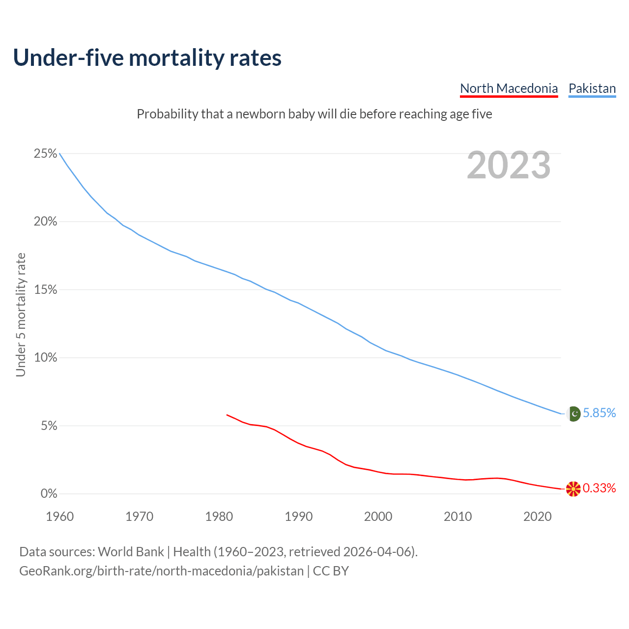 The chance that a newborn baby will die before reaching age five is 0.33% in North Macedonia and 5.85% in Pakistan. Above is a chart with historical data on under-five mortality rates.